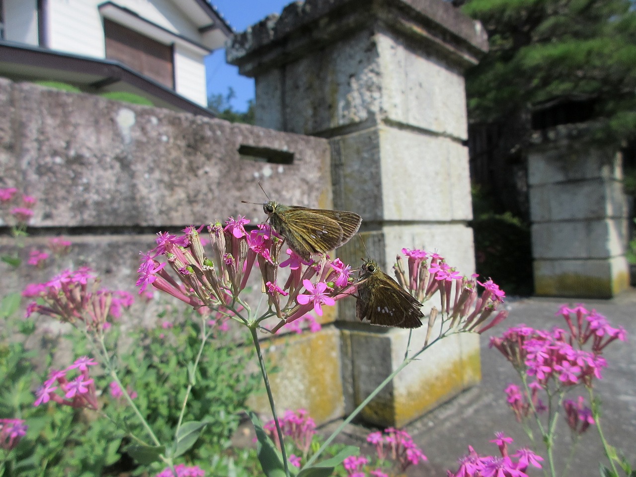 オオムラサキを待つ間にオオチャバネセセリを見つけた。何頭かが民家の玄関わきに咲いていたムシトリナデシコで吸蜜していた。よほど集中していたのか、近づいても一向に逃げようとしない。