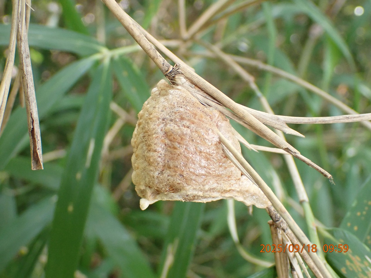このカマキリに出会う少し前にこの近くのササや枯草の茎に産み付けられた卵嚢をいくつも見た。