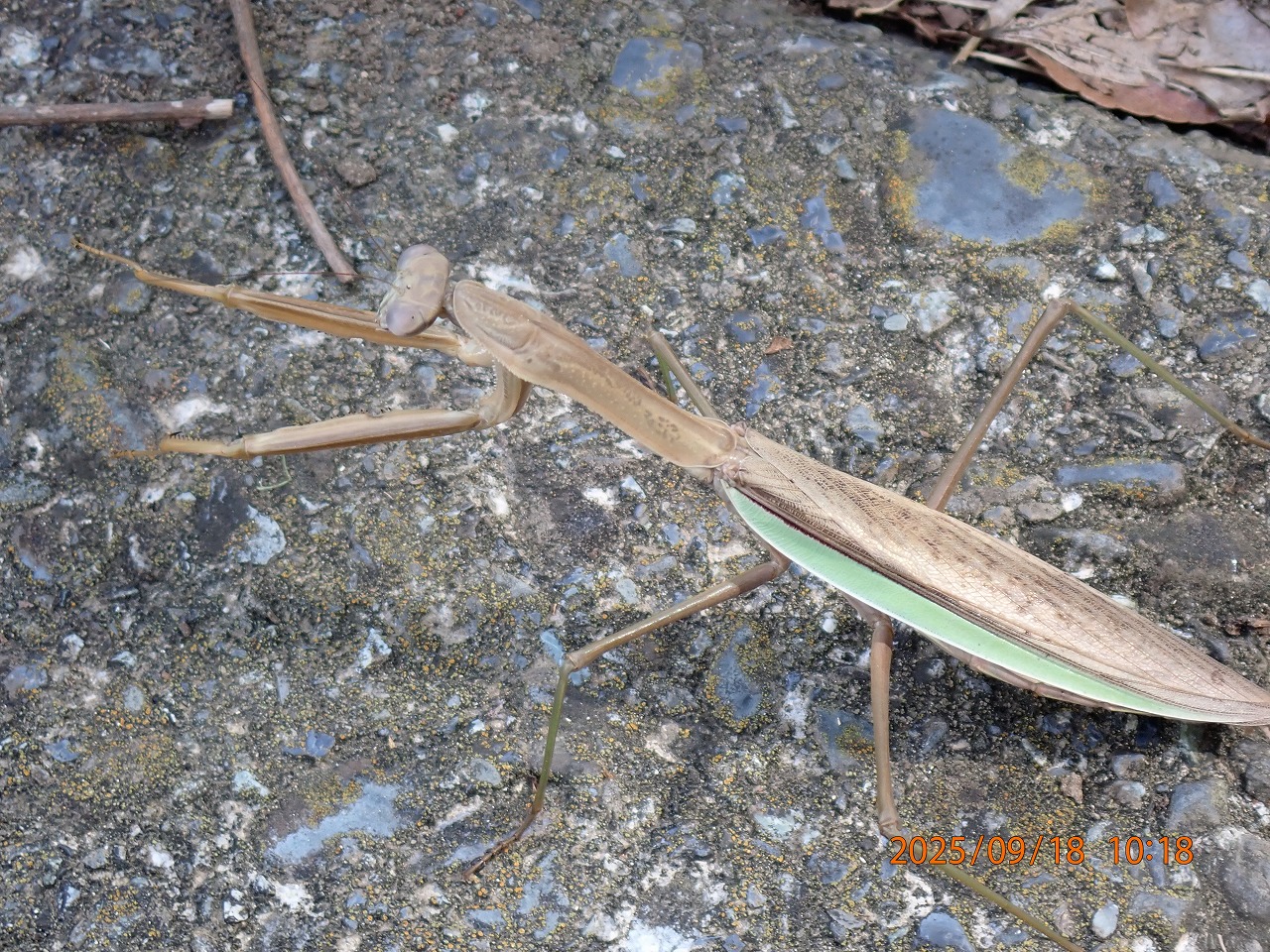 カマキリはチョウの天敵の最右翼だが、多摩川にはチョウとともにたくさんのカマキリも棲息している。この日、トランセクト調査中に1頭のオオカマキリと出会った。地面をゆっくり這っていたので、拾い上げちょっと遊びながら一緒にチョウのカウントをしていた。それほど凶暴な感じはしないが、外からの刺激があると直ぐこのように鎌を構え臨戦態勢をとる。