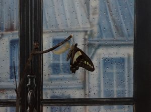 カマキリはチョウの天敵の最右翼だが、多摩川にはチョウとともにたくさんのカマキリも棲息している。この日、トランセクト調査中に1頭のオオカマキリと出会った。地面をゆっくり這っていたので、拾い上げちょっと遊びながら一緒にチョウのカウントをしていた。それほど凶暴な感じはしないが、外からの刺激があると直ぐこのように鎌を構え臨戦態勢をとる。