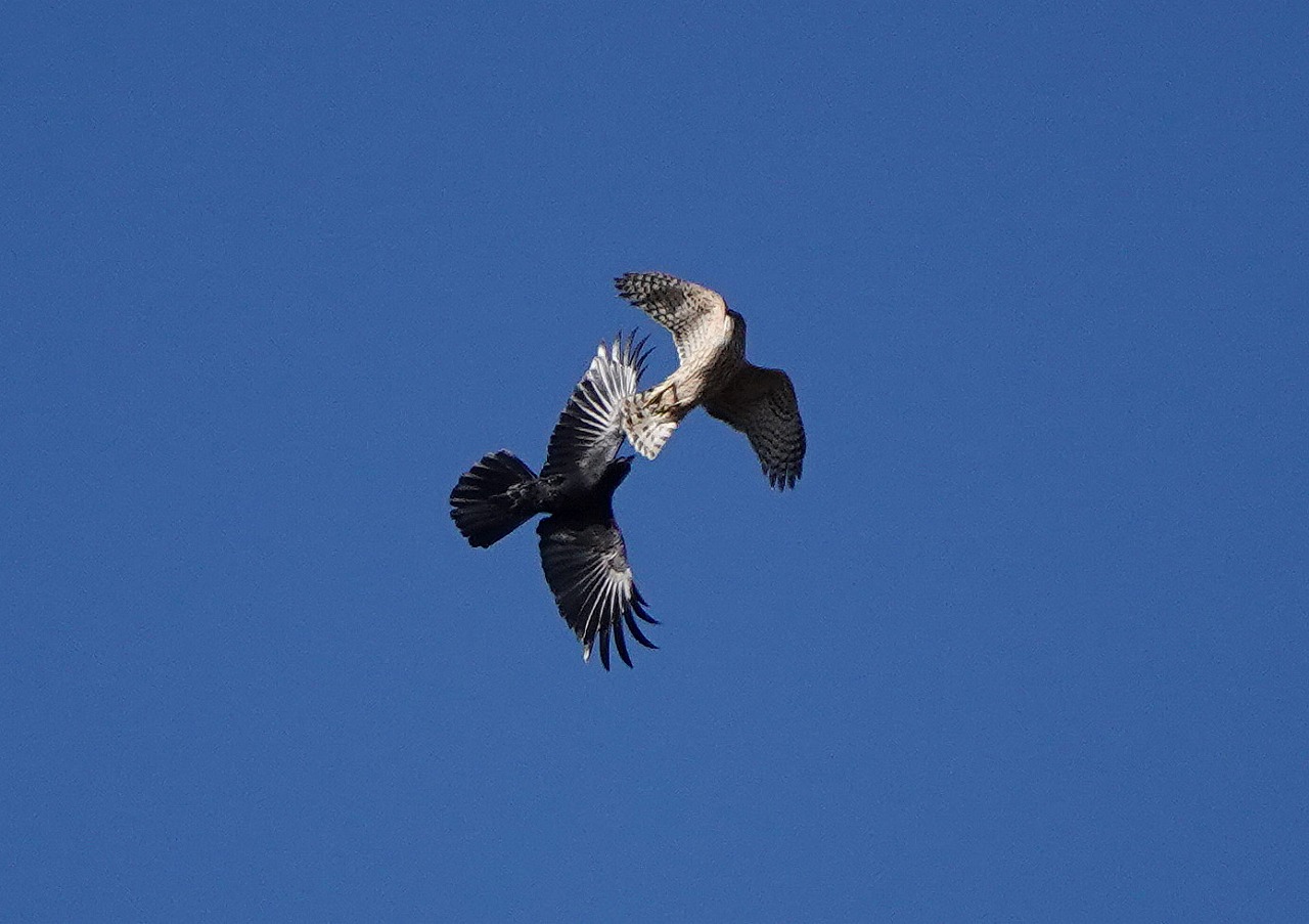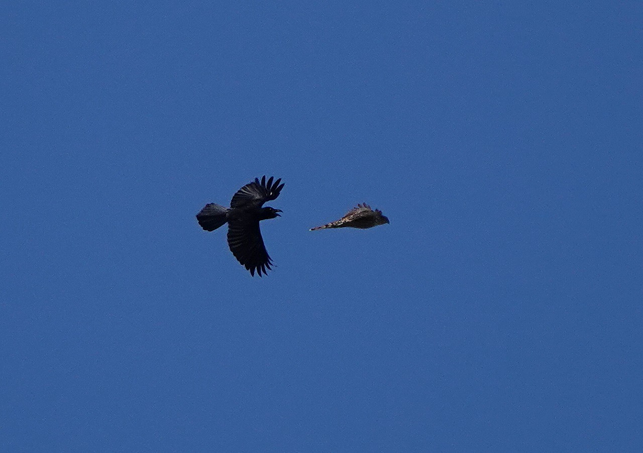 執拗にカラスが猛禽を追尾している。猛禽はカラスに比べて小さく幼鳥と見られる。今回、幼鳥とはいえカラスは集団でなくただの一羽。カラスが天敵の猛禽を追いかけ威嚇するのは巣やヒナを守るため(人間をも襲う)らしいが、延々と追尾して、猛禽は幼鳥でもありひたすら逃げまわるだけで可哀そうになってくる。チョウゲンボウかと思ったがどうやら、オオタカの幼鳥のようだ(間違ってたらごめんなさい)。
