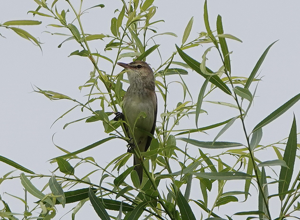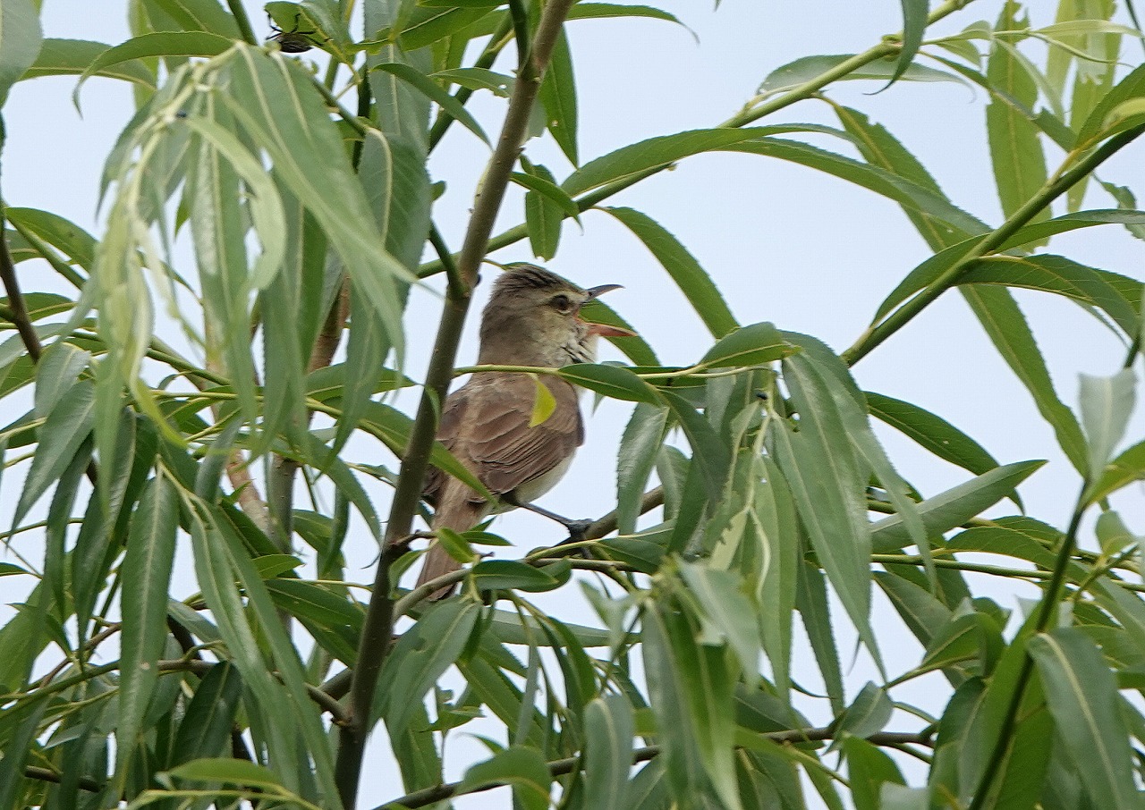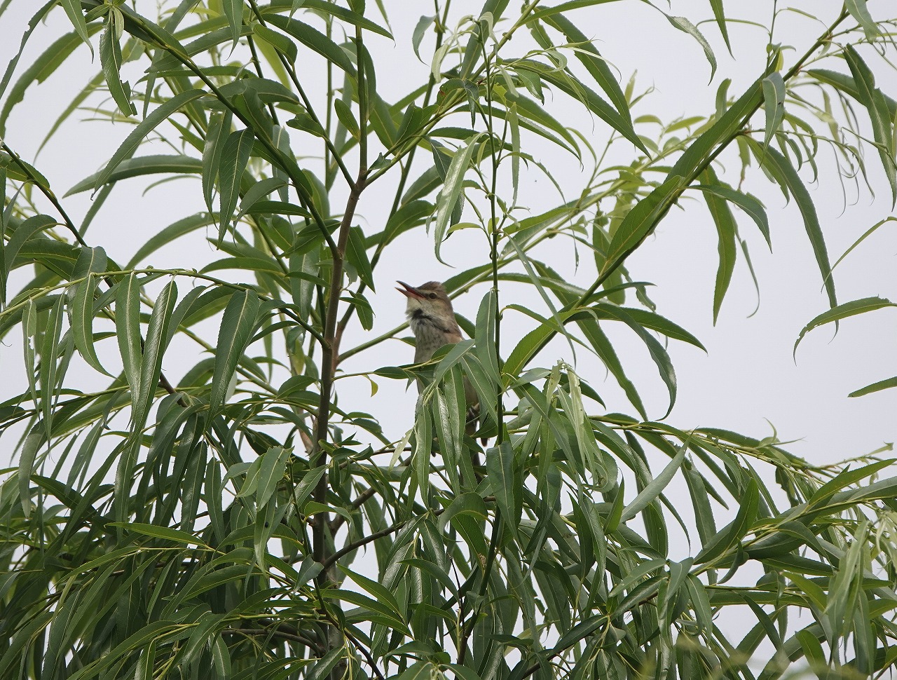 諦めて、一度10mほど離れてしばらく眺めているとヤナギの頂部あたりから一羽の鳥が飛立った! なんとヨシでなく樹にいたのだ、それも頂部に・・・耳悪いのかな?? ・・・ということで、渦中にあって壁にぶち当たった際には一度、距離を置くということがいかに有効かということが今更ながら身に染みた。そして待つことしばし、やはり好きな樹なのだろう戻ってきてすぐ手前のヤナギの頂部にとまり囀り(「さえずり」という言葉はまるでふさわしくないが)だしたので、これまで正体不明だった妙な鳥を撮影することができた。この声がメスにアピールするのだろうから、まあ、いろいろ・・・