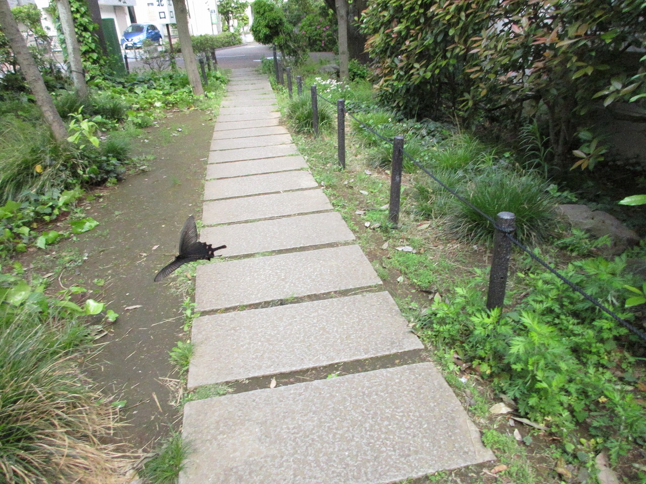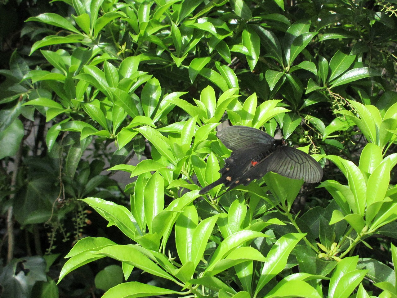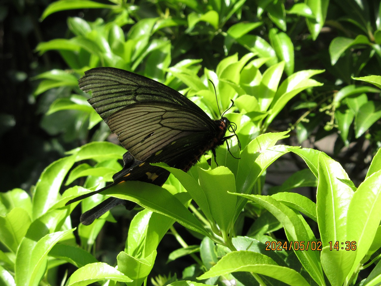 例年なら4月中旬には出会えるが今年は5月になって初めてジャコウアゲハを見た。近所を散歩中、木立の中から目の前を横切る黒い影。飛び去るでもなく、そのあたりをさまよっている。止まったのでよく見ると羽化からはだいぶ時間が経っていると見え、そのオスの翅の傷みが激しい。この冬は、我が家の越冬蛹はなかったので、多摩川から飛んできたものと思われる。もし、メスならば、ウマノスズクサはもう我が家のベランダでもしっかり育っているので、産卵場所には問題なかったのに・・・。いずれ、メスもやって来よう。それを期待しよう。