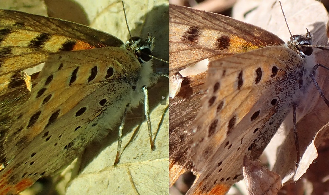 この2頭のベニシジミは、1週間の間に翅の鱗粉はさらに剥がれ落ちてスカシバ状態に近くなってはいますが、ほぼ同じ角度で翅の傷み具合などを見る限り、同一個体のようです。