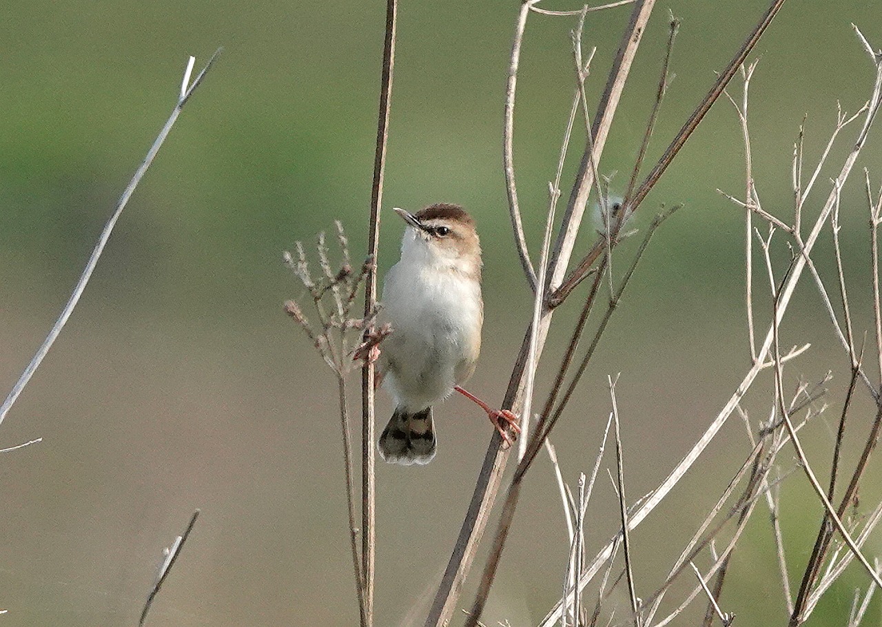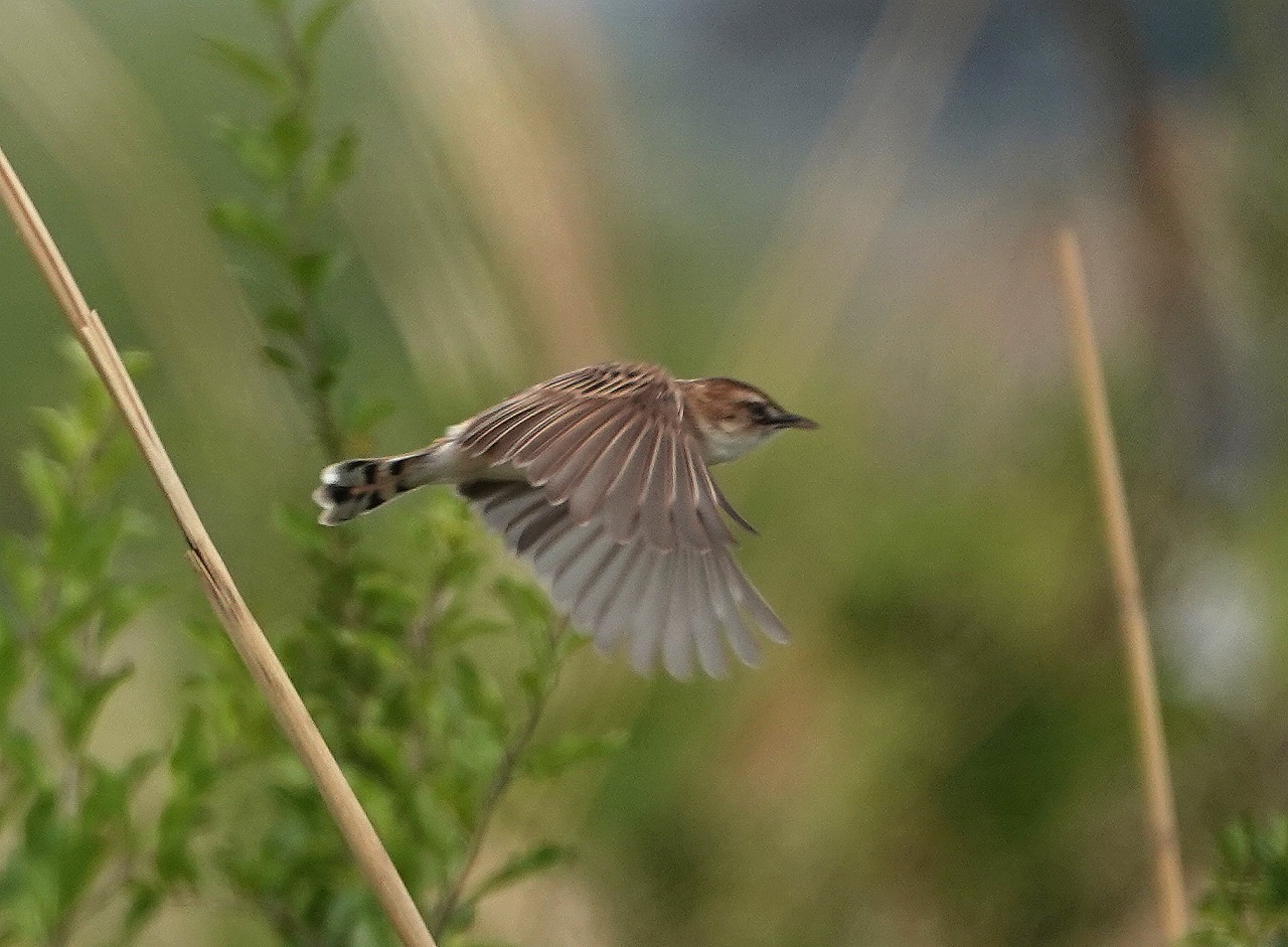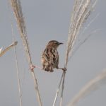 「声はすれども・・・」とにかく小さく速いので飛んでいる姿を見つけるのが困難、降りてきてとまる位置を把握するのはさらに至難の業なのだが、今日は運良く見つけて短いが「ヒッ ヒッ ヒッ」のところの動画も撮影できた。ある文献によると(※)、セッカは一夫多妻制で、繁殖期にはオスはクモの糸を利用していくつもの巣を作り(20近くのことも)、そのそれぞれにメスを誘い、産卵後の子育てはメスに任せきる。一夫多妻とは言え、これは全体の4割、3割が一夫一妻、残りの3割は独身とのこと(※ バードリサーチニュース2006年5月)