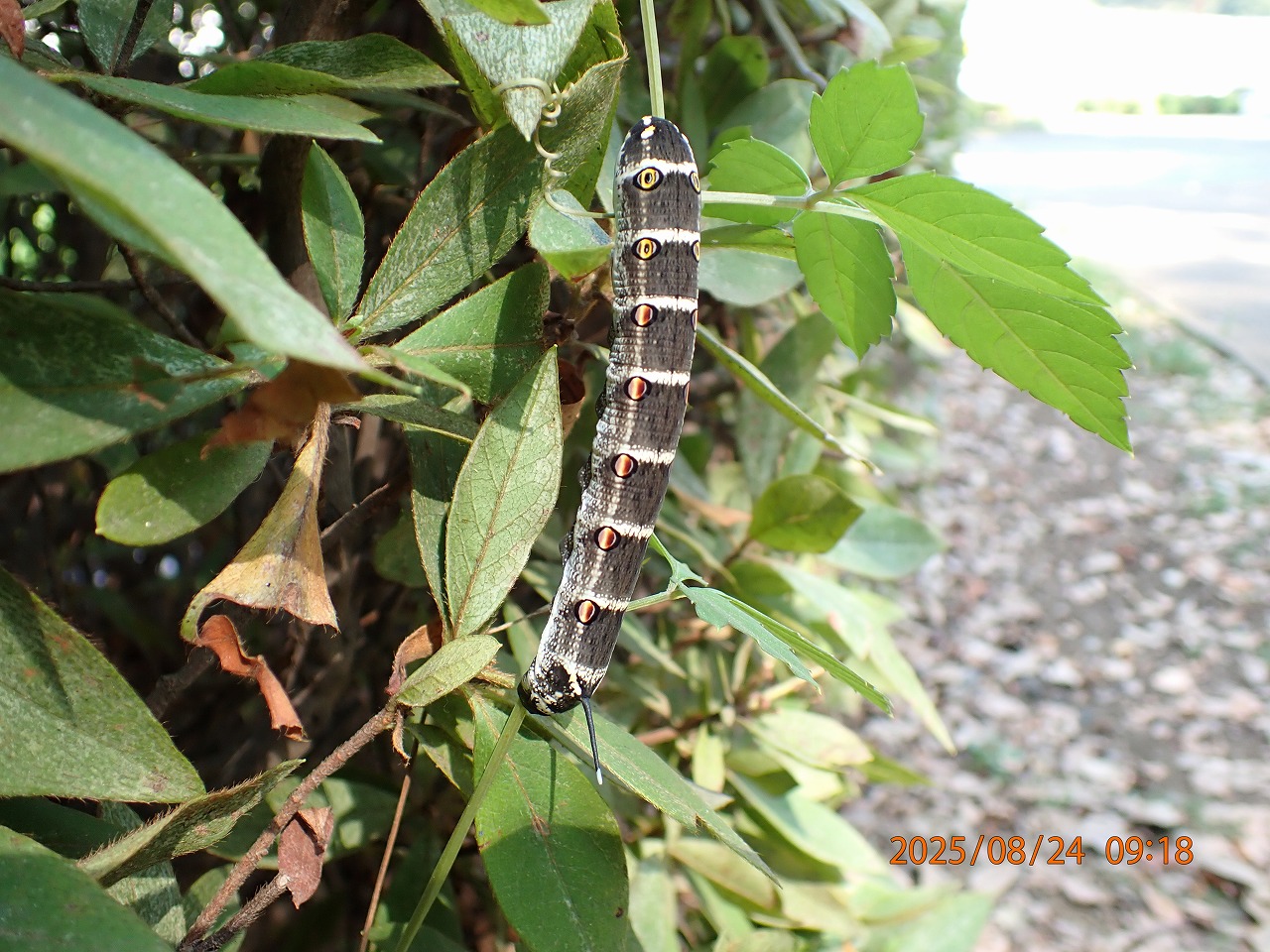 幼虫はと言えば、毎年花壇の花を食い荒らし、特にベゴニアなどは気が付くと一晩で何株もが茎だけにされてしまう。その姿たるや、見るからにグロテスクで何となく毒を持っていそうだ(空想上の生き物「ツチノコ」の想像図を思わせる)。しかも、至って大食漢なのだ。以前には、花壇を守るため駆除もかねて幼虫を捕まえて飼育を試みたこともあるが、蛹になる前に死んでしまい、自分で飼育した成虫を見ることはなかった。