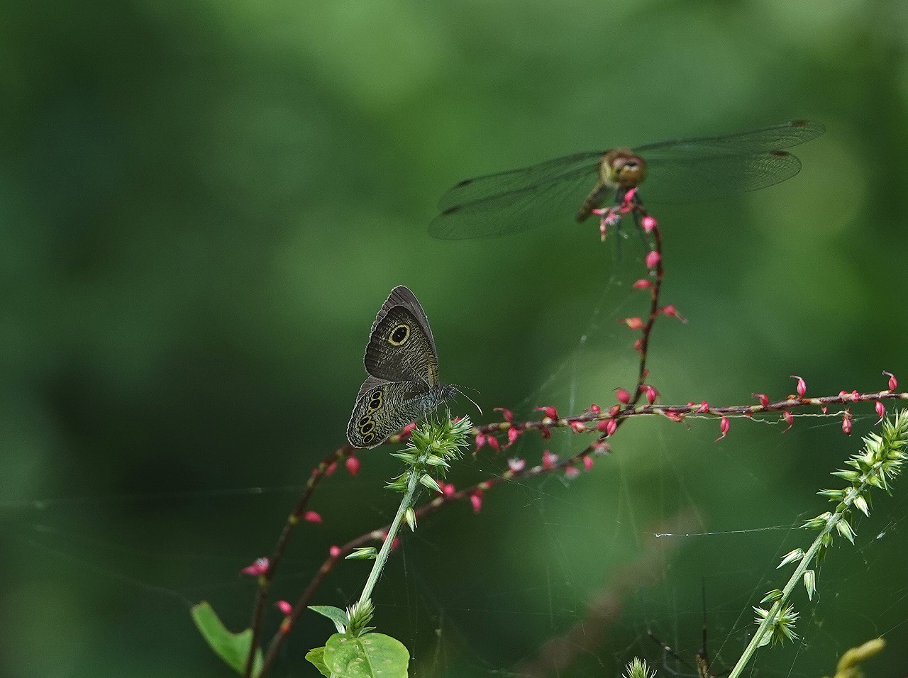 ↓ ヒメウラナミジャノメとアカトンボ(アキアカネだかナツアカネだか不詳)がミズヒキにとまっている。蜘蛛の巣注意!