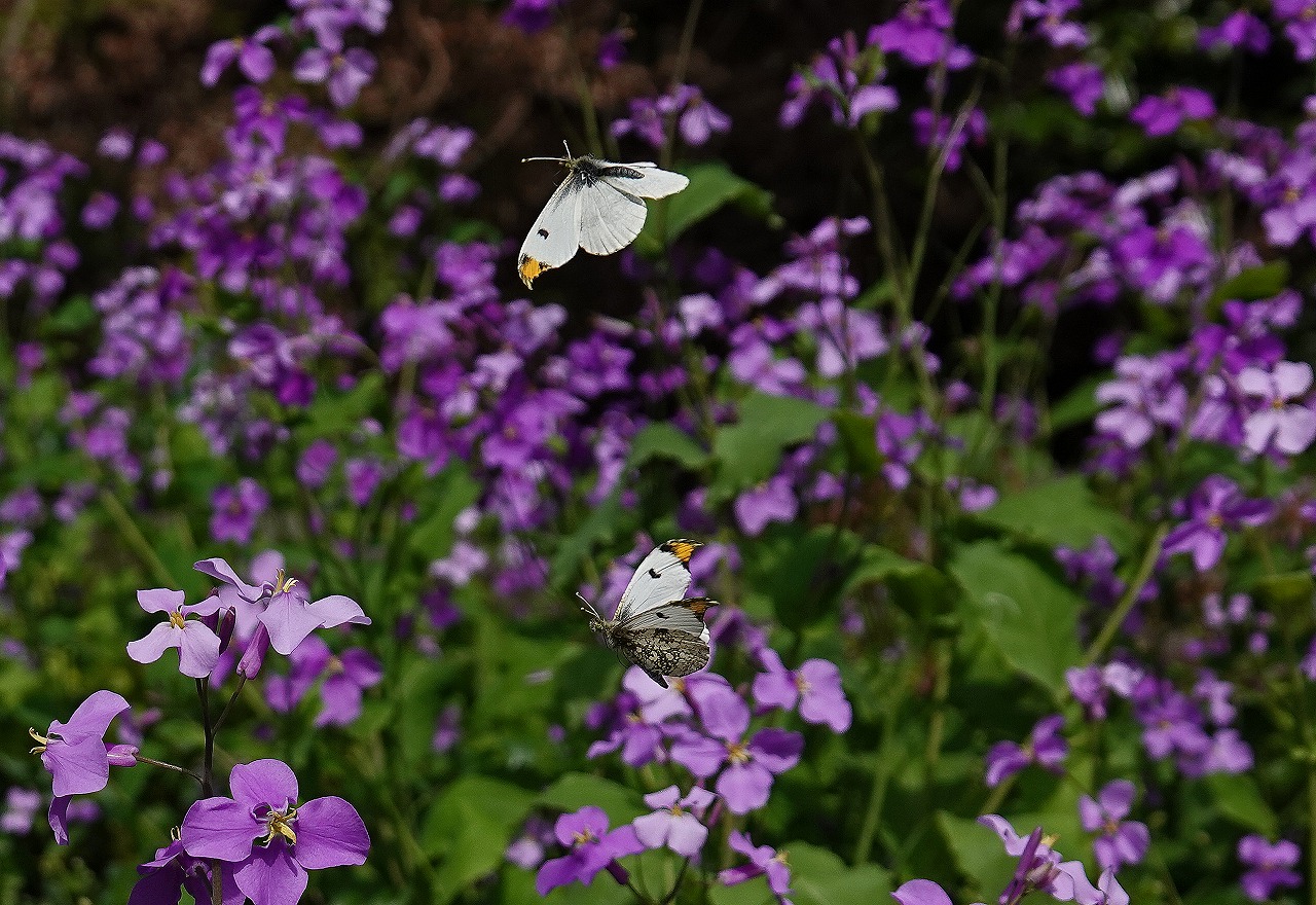 紫の花は、オオアラセイトウ、ほかにもショカツサイ(諸葛菜)或いはムラサキハナナ(紫花菜)などと呼ばれる。前の多摩川土手の記事ではツマキチョウの名前の由来でもある「翅の先(つま)が黄色い」オスが撮れてなかったので今回はオスの画像をアップした、と言うか、なぜか個体数が多かった割にメスは見なかった。そのおかげかオス2頭がじゃれ合っているのが上のシーン。この花の群落はどうやらツマキチョウたちの通り道(アゲハチョウ類のような蝶道というほどはっきりはしていないと思うが)にあり、両方向から飛来しては吸蜜することもあれば、フラフラと飛びながら結局とまらずに飛び去ることも少なくない。