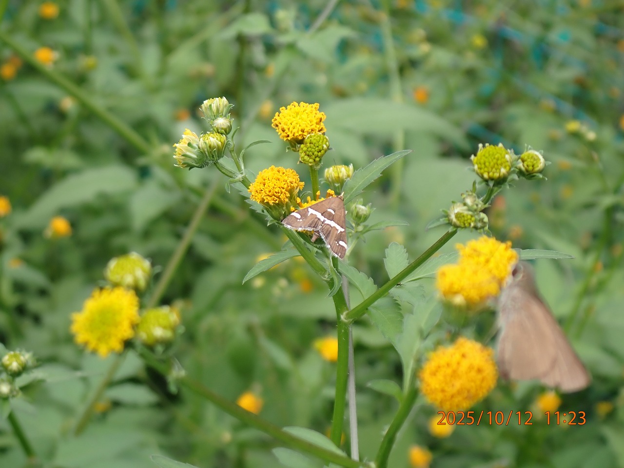 調べてみてシロオビノメイガという体長1㎝足らずの小さな昼行性の蛾(てん菜やホウレン草などの害虫でもある)で、驚いたことに、この小さな蛾が東アジアや東南アジアなど周辺国から毎年夏以降に長距離飛来しているという。しかし、はるばる海を越える飛翔力があるものの、寒さには弱いらしく、日本での越冬はほとんどの地域で困難とされている。高温の年は特に夏以降に発生が多くなり、9月以降この時期がいわば最盛期のようだ。