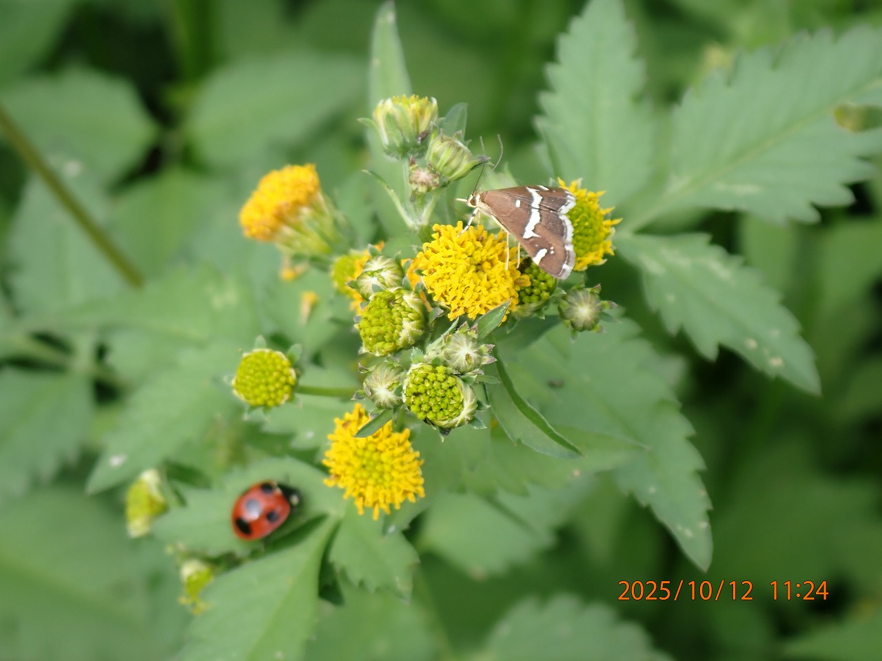 秋が深まるにつれ、多摩川の土手から河川敷一帯にコセンダングサが繁茂する。ほとんど花弁がないような花を咲かせる(?)が、チョウをはじめたくさんの昆虫類が蜜を求めて集まってくる。蝶としてはイチモンジセセリ・チャバネセセリ・キタテハなどはこのコセンダングサ周辺で爆発的に数を増している。トランセクト調査でその中を歩く時、吸蜜していたチョウたちが一斉に飛び立ち、再び場所を変えて吸蜜を始める。その中で一際目立つ動きをする蛾のようなものがいる。その大群(あまりにも数が多い)が一斉に飛び立ち、また付近に止まるのだが、その時必ずと言っていいほど皆葉裏に回り込み隠れてしまう。撮影にはなかなかタイミングが合わず苦労したが、そっと近寄り油断して吸蜜しているところを撮ったのがこの写真だ。