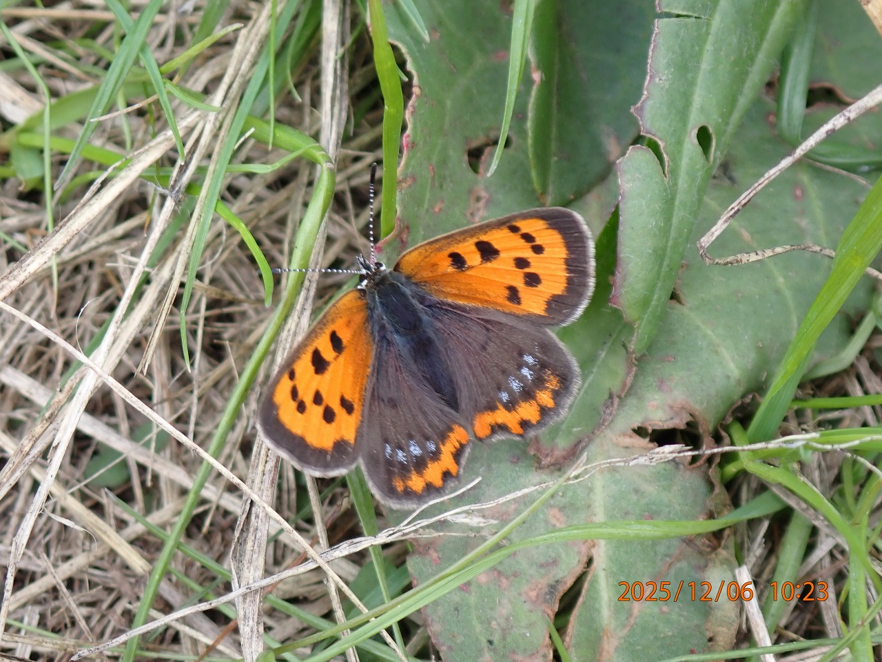 周りのあまり生気のない草に混じってギシギシが葉を広げている。その葉の上で翅を全開にしている1頭のベニシジミを見つけた。近づいてもすぐには逃げない。そして、翅を開いたまま葉の上でゆっくりとくるくる回っている。その翅は鮮やかな色をしていて、縁毛もきちんと揃っている。どうも羽化したばかりで、これから飛び立つ準備をしていたようだ。しかし、気の毒だが、ベニシジミはこのまま成虫では冬は越せないし、仲間もすでに数を減らしてしまっている。遅すぎた羽化は、このベニシジミにとって厳しいものとなるのだが・・・。