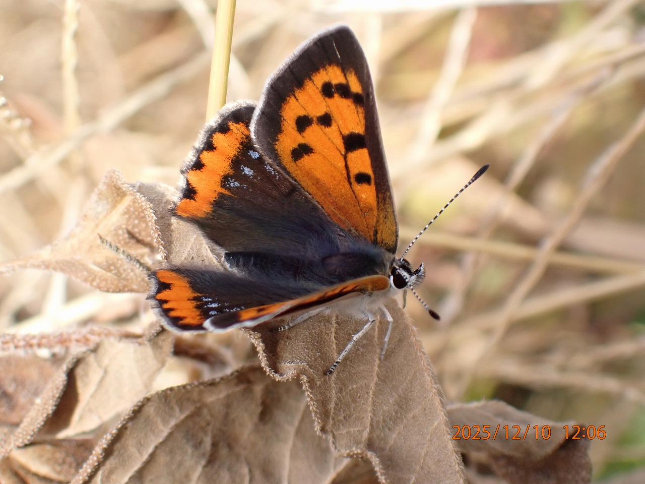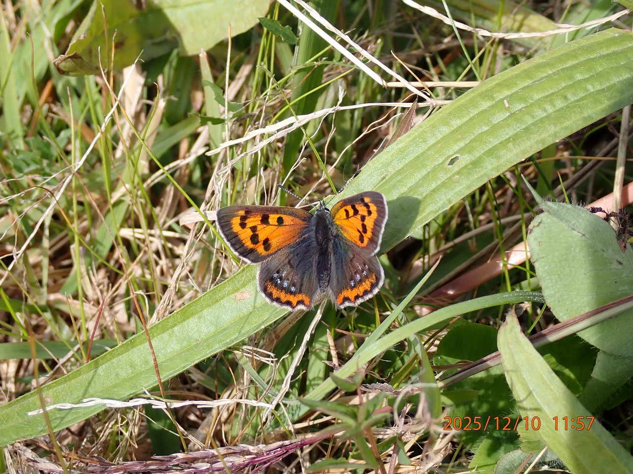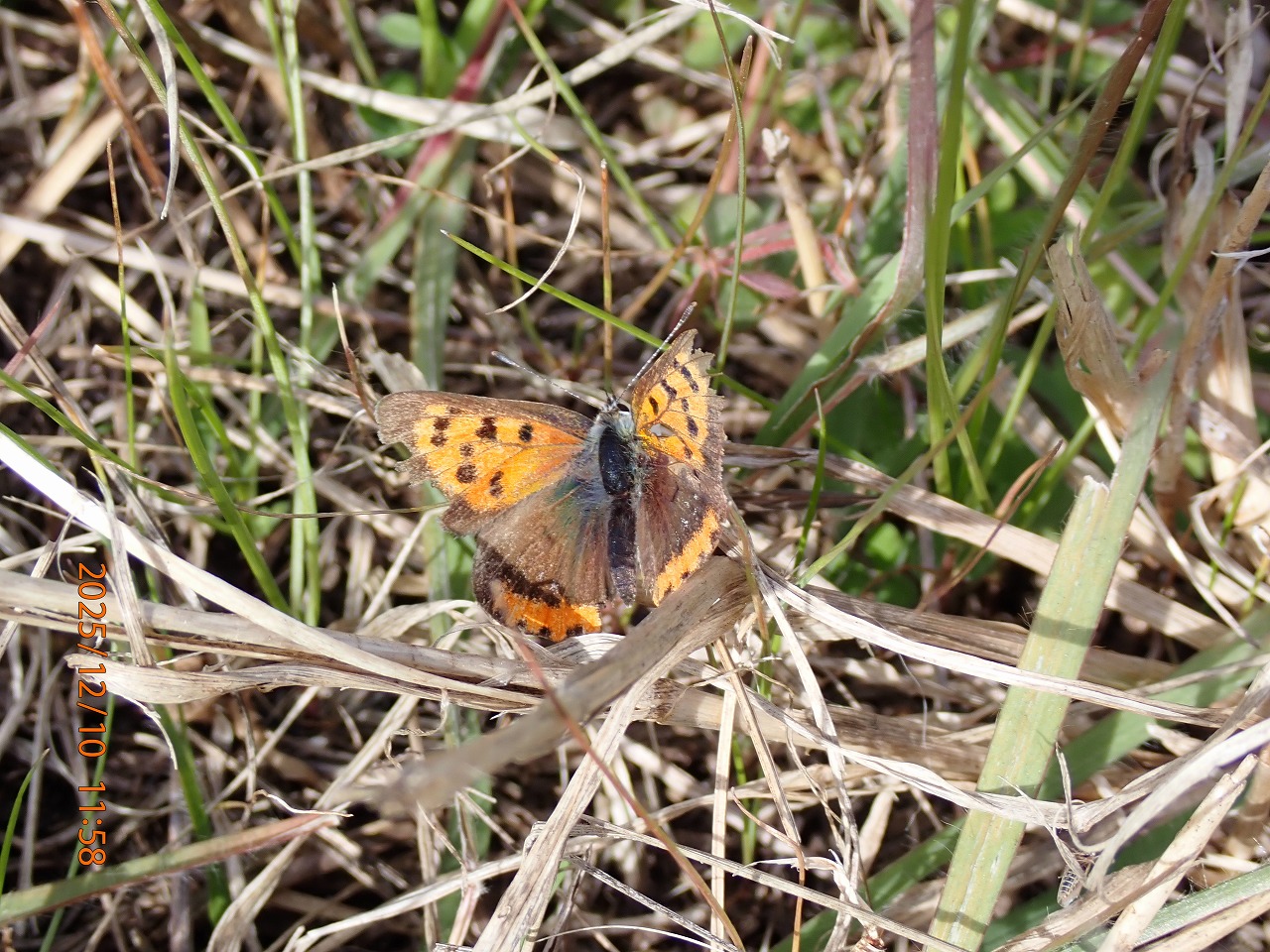 多摩川土手の陽だまりには種類は少ないが、まだまだ最後まで頑張るチョウがいる。先日はかなり草臥れたベニシジミばかりだったが、この日は最近羽化したばかりのような新鮮なものも混じっていた。しかも、この時期だというのにかなり翅のすり切れた年寄りのオスが若いメスに求愛をしているではないか。老いらくの恋なのか。ベニシジミの食草はギシギシなどで、この植物は真冬でも緑の葉を持っているので、産卵さえすれば幼虫は冬場も餌に困ることはない。幼虫は寒さに強い。