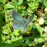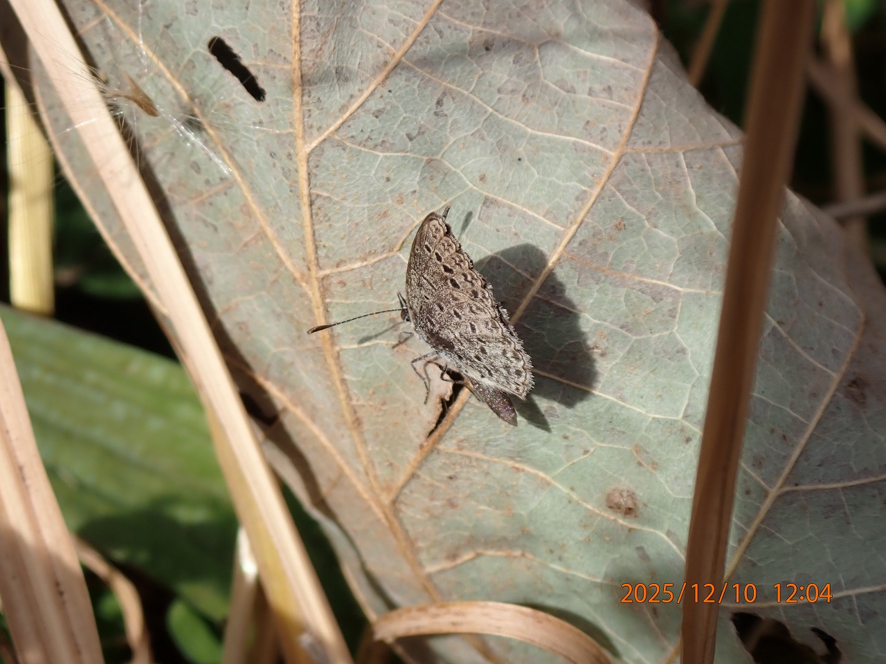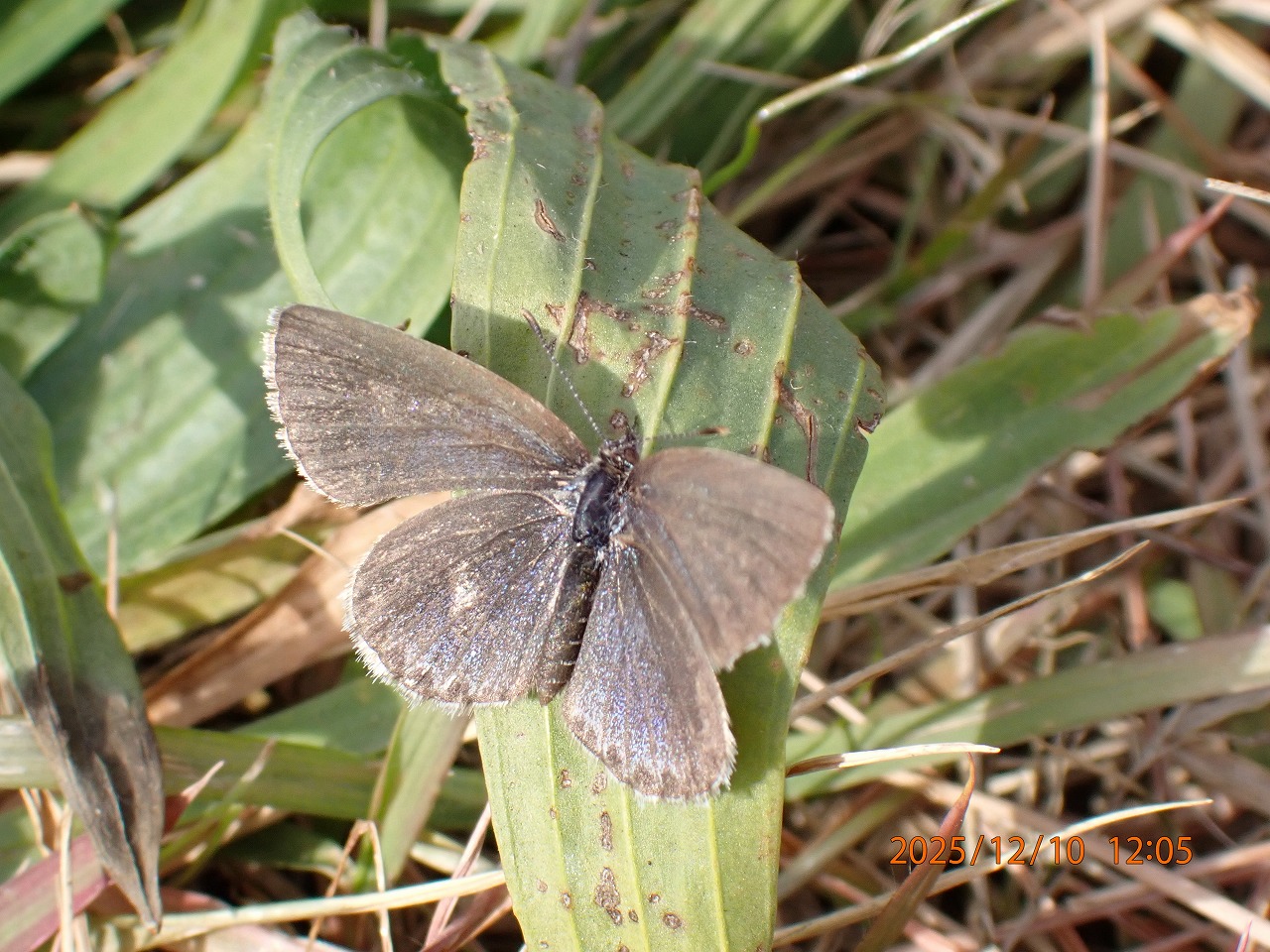 多摩川土手で草陰にじっと止まっているヤマトシジミを見つけた。翅裏の鱗粉も落ち、かなり弱っているようだが、そこから出て太陽に向け翅を大きく広げた。翅には青く輝く鱗粉がわずかに残っている青メスだった。
