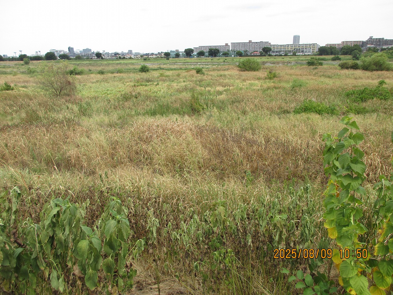 今年は暑い日が長く続いているし、梅雨の時期でさえまとまった雨も殆ど降らなかった。多摩川河川敷もカラカラでもっと緑であるはずの多くの植物からは生気が失われ、茶色が目立つようになっている。写真の手前に見えるキクイモも立ち枯れ寸前、奥のススキ・オギ・セイバンモロコシなども葉が完全に変色し、まるで秋になったようだ。