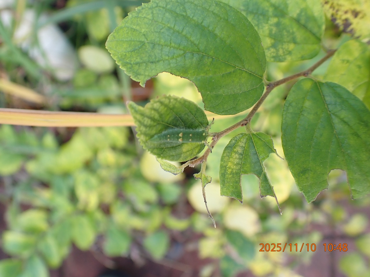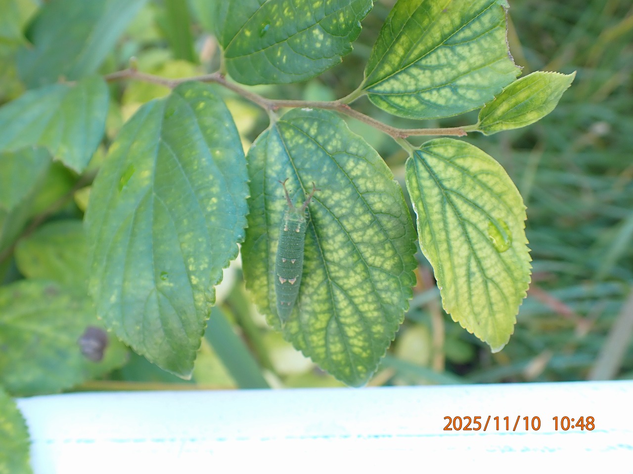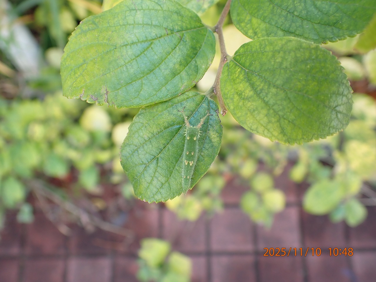 秋が深まるにつれ道端に生えたエノキの葉っぱも徐々に色付き始めた。葉の上にはまだこうして2-3cmほどのアカボシゴマダラの幼虫があちこちで見られるが、もうしばらくすると皆地面に降りて枯葉などの中に潜り込んで春まで冬眠に入るだろう。