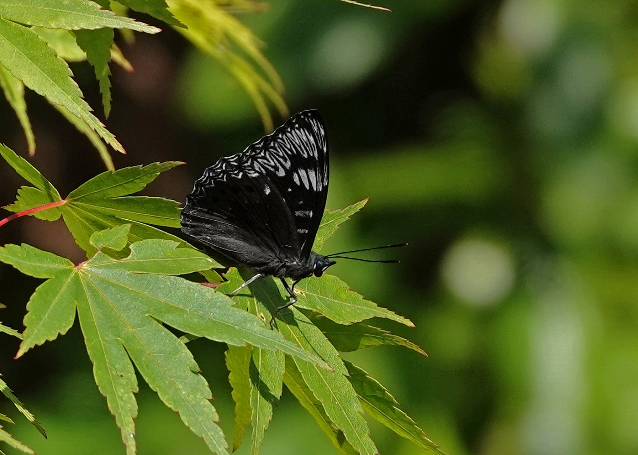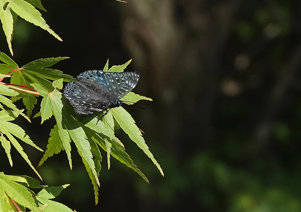 テリトリーを監視するオスのスミナガシ。縄張り内に他のオス、アゲハだろうが鳥だろうが侵入すると猛烈に追尾して追い出してしまう。縄張り内に入ってくるメスを獲得するのが目的ではあるが、写真のように開翅して威厳を誇示する姿もよく見られるので撮影にはもってこいのタイミングではある。タテハの中で一番好みの蝶であるが、美しい翅(裏もまさに墨流し模様で美しい)と碧眼、そして残念ながらなかなか同時に写せないがゼンマイ型の口吻は赤い。