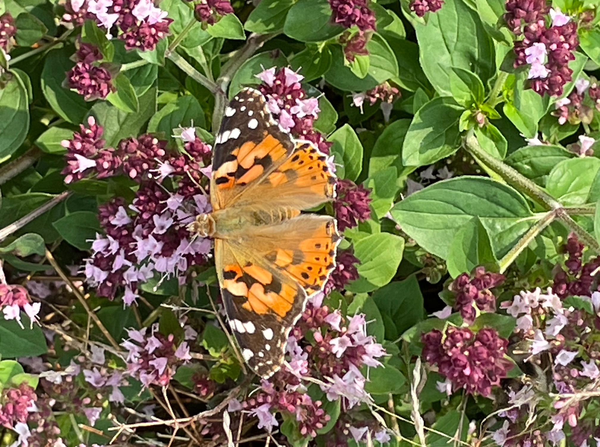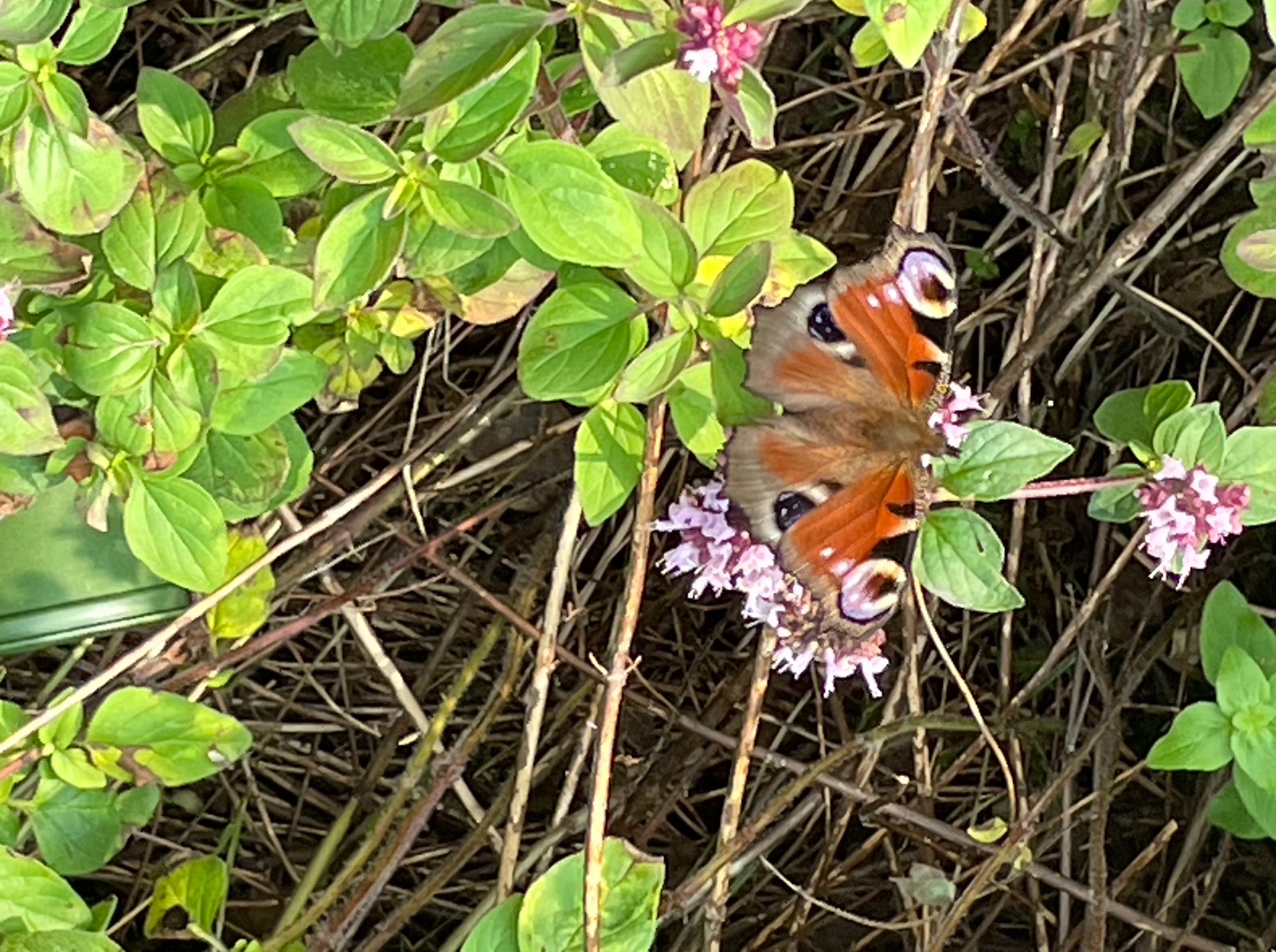 添付の写真にはオレガノ(多分?)のような花で吸蜜しているヒメアカタテハとクジャクチョウが写っていたのでご紹介する。