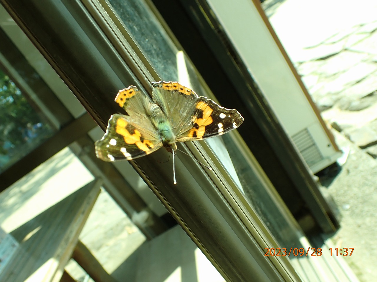 ルリタテハ: 頂上近くの手摺の上で翅を大きく広げていた。かなり近寄っても全く逃げようとしない。