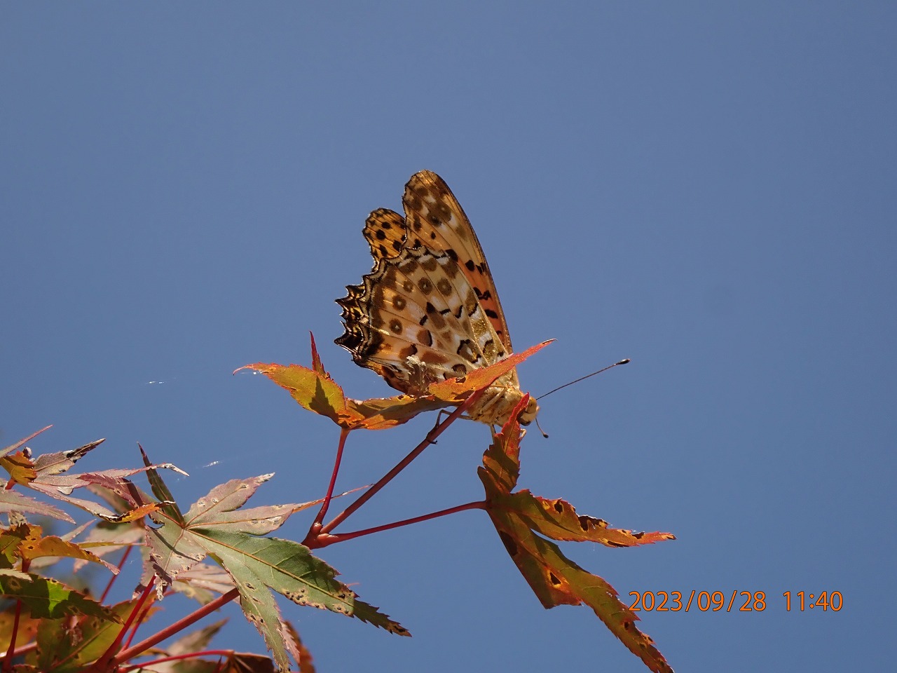 ツマグロヒョウモン: ルリタテハ(瑠璃・青)・アカタテハ(赤)ときたので、次はキタテハ(黄)でもいれば面白いと思っていたが、モミジの梢で見つけたのはキタテハではなく黄色いツマグロヒョウモンのオスであった。