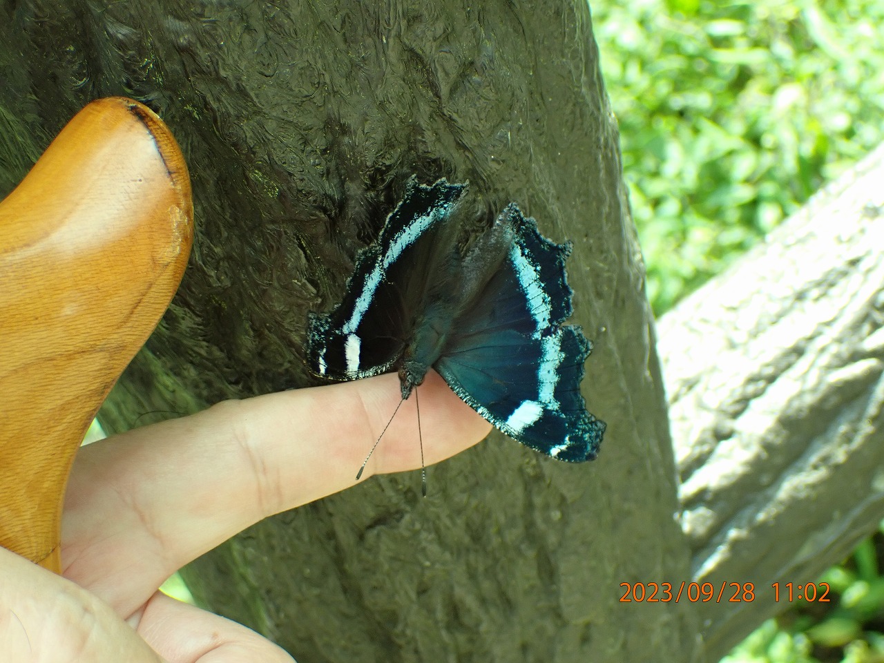 一旦は指に乗っていたのだが、カメラを片手で操作していたためにそのシーンは残念ながら撮りそこなってしまった。自然のなかでこうしてチョウと触れ合えるのもなかなか楽しいものだ。ただ追い掛け回すのではなく、こちらの気持ちに応えてチョウが手に乗り移って来てくれるのが何ともうれしい。読者の皆さんも機会があれば試されてはいかがでしょう?