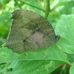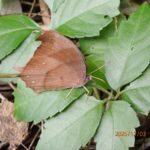 約1.5kmのコースをいつものように1時間ちょっとかけてチョウを数えながら歩く。今年はなぜか堤防の内側の斜面から下までは国による9月中の草刈りがされずに、草ボウボウのままだ。茂ったクズやアレチウリの蔓に足を取られながら、チョウを目で追い一つ一つ記入していく。コースの途中で大発見があった。足を進めた瞬間、足元から大型のチョウが急に飛び立った。一瞬で分かった、これはクロコノマチョウの動きそのものだ。多摩川にもいたのだ。低く飛び場所を変えて再び舞い降りた時撮った写真だ。さらに角度を変えて撮ろうとしたが結局逃げられてしまい、この角度の写真しか撮れなかったが、羽化したてのメスのようだ。