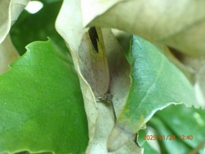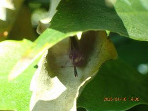発見後1月19日までは寒かったので全く動きはなかったのですが、今日20日は朝方まで雨はあったものの日中気温は3月並みになるとの予報だったので朝10時過ぎに見に行くと、何と既に1頭(個体A)はいません。もう1頭(個体B)もいるにはいたが、頭の位置が反対向きになっているのです。やはり、気温が上がると動き出すのかと思い、確認のため午後にもう一度見に行くと、いなかった個体Aがまた元の場所に戻ってきているのです。そしてもう1頭の個体Bも頭の位置を最初の位置に戻しているのです。
