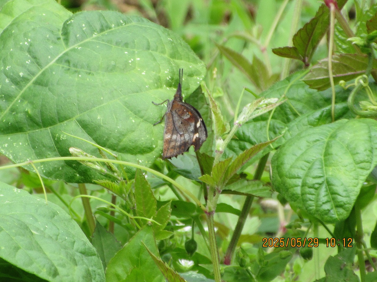 この日は、2回目(2頭目)のトライで奇麗に開翅したテングチョウに巡り合えた。この2番目に出会った個体は最初はヤマグワの木のあたりを飛んでいて、なかなか下に降りてこない。高い葉の上で開翅しているのが、上の写真のとおり下から陰でハッキリ分かるのだが、これではどうしようもない。ここはもう一度我慢比べだ。