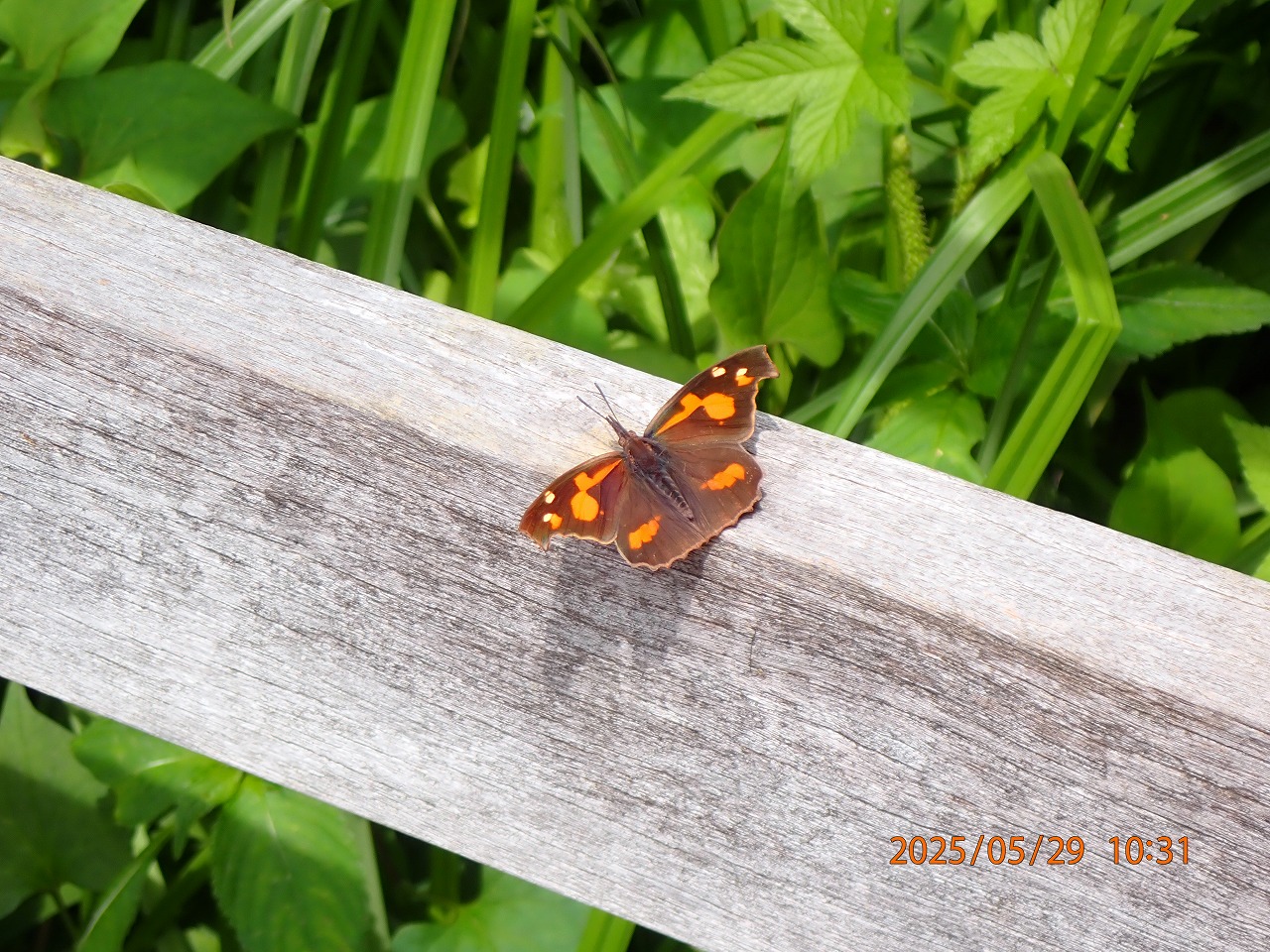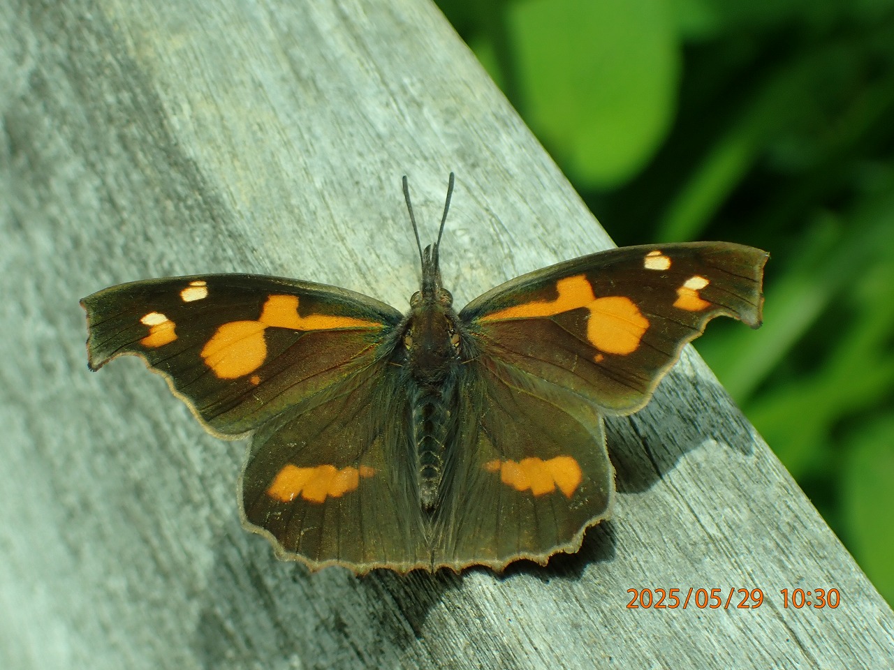 しばらくすると、今度は下に降りて来て近くの手摺に止まった。そして、まるで標本のように開翅してくれた。