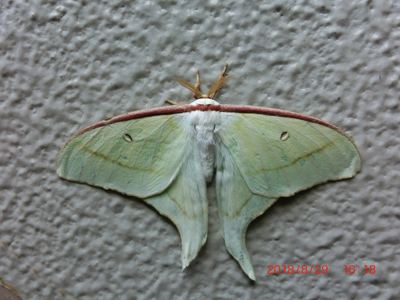 オオミズアオはいつもこのように人間の生活場所に突然現れて驚かせます。どこか違う世界からやって来たかのような感じさえ漂わせて静かに壁などに止まっているところもしばしば見られます。