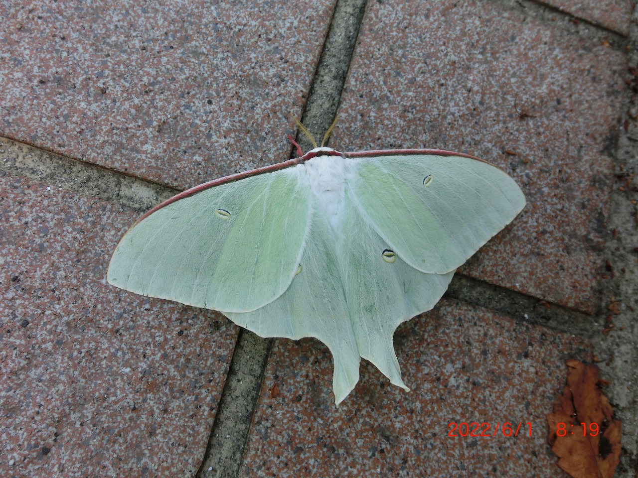 ある初夏の朝、植え込み近くの地面に薄緑色の翅を大きく広げたオオミズアオが止まっていました。そこで、手乗りを試みたものがこの写真です。手にズシリと重さを感じました。