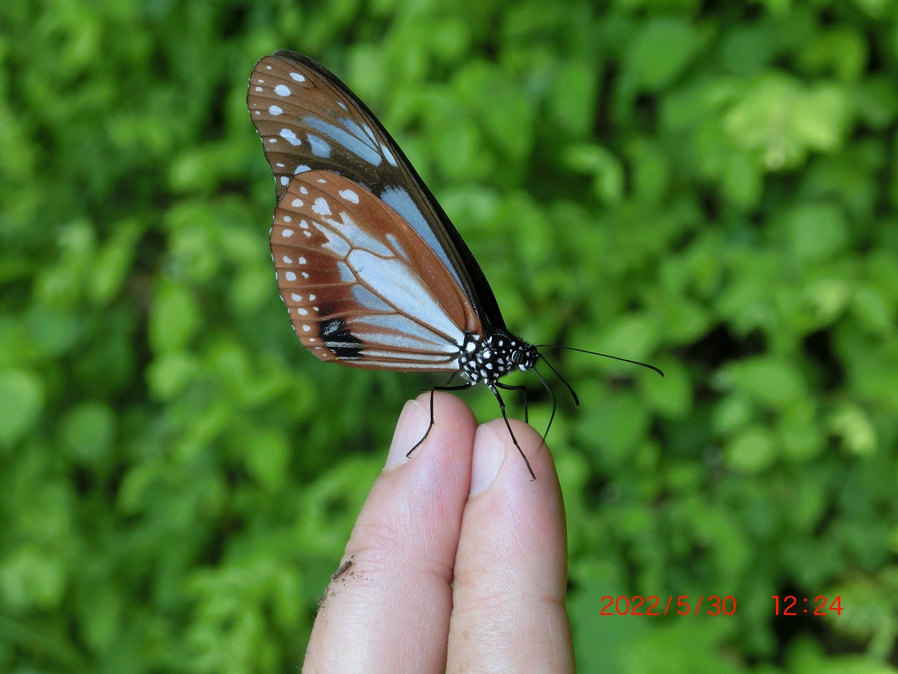 このチョウは私が最も好きな蝶なのですが、なぜか不思議なことに手乗りの回数は少なく、写真に残せたのは翅を閉じたままのこの1枚だけなのです。この後も開翅を期待してじっと待ち続けたのですが、最後まで開翅はしてくれませんでした。