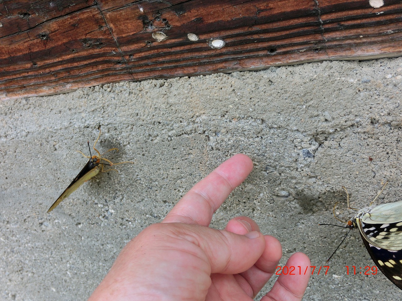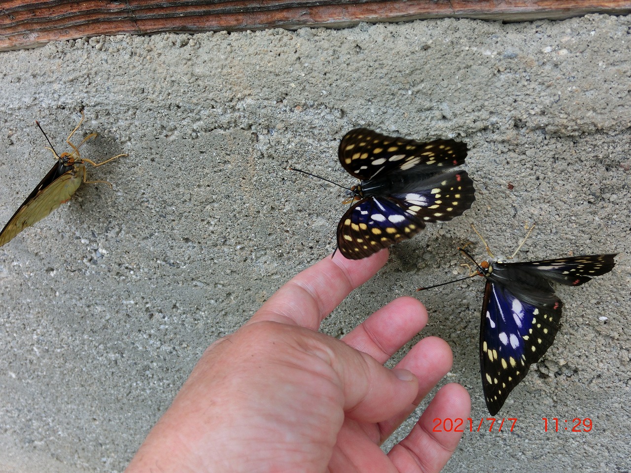 数頭が民家の古いコンクリートの壁でミネラルを摂っている時にそっと指を近づけてみました。何度も失敗したのですが、最終的に1頭が付き合ってくれました。後にも先にも手乗りが成功したのはこの1頭だけ。手に乗せるとズシリと重さが感じられました。
