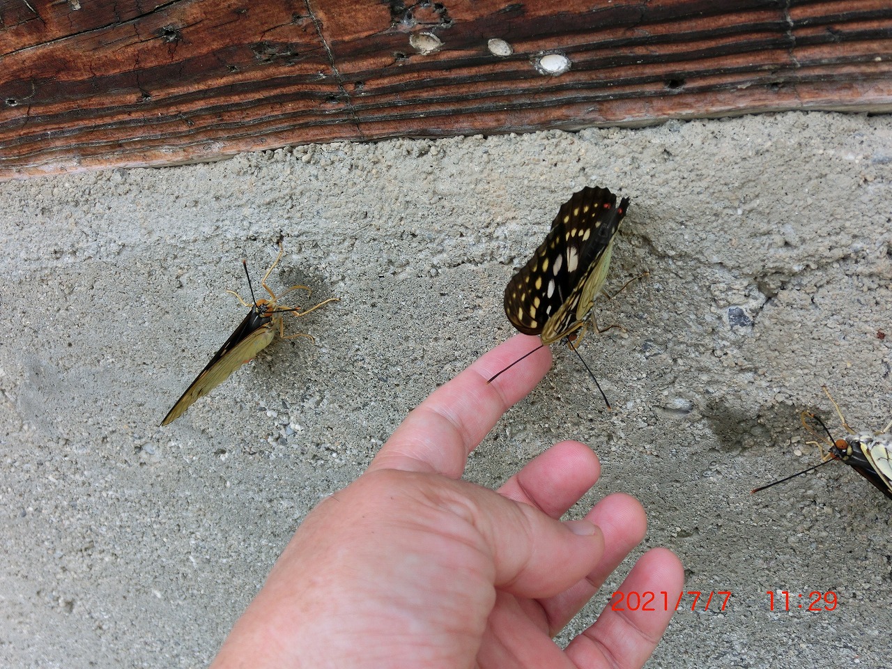 数頭が民家の古いコンクリートの壁でミネラルを摂っている時にそっと指を近づけてみました。何度も失敗したのですが、最終的に1頭が付き合ってくれました。後にも先にも手乗りが成功したのはこの1頭だけ。手に乗せるとズシリと重さが感じられました。