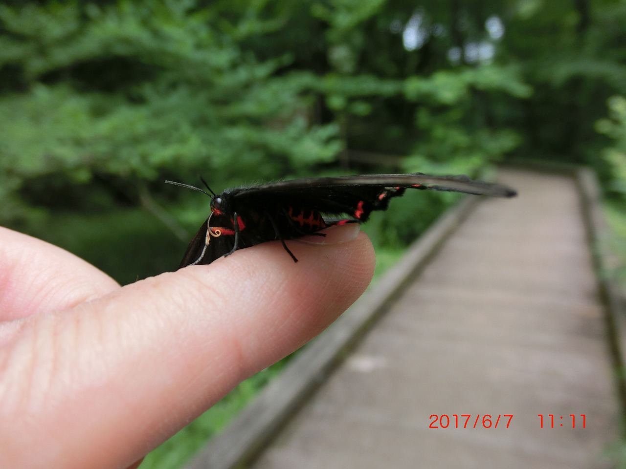 ジャコウアゲハは幼虫時代に食草のウマノスズクサから植物毒を体内に蓄えているために鳥などに襲われることが殆どありません。ということで他のチョウなどもジャコウアゲハそっくりに擬態することで自らの身を守っていると考えられます。次の写真はアゲハモドキという蛾ですが、ジャコウアゲハそっくりの姿をしています。これはその手乗りしたところですが、上のジャコウアゲハと見比べてください。