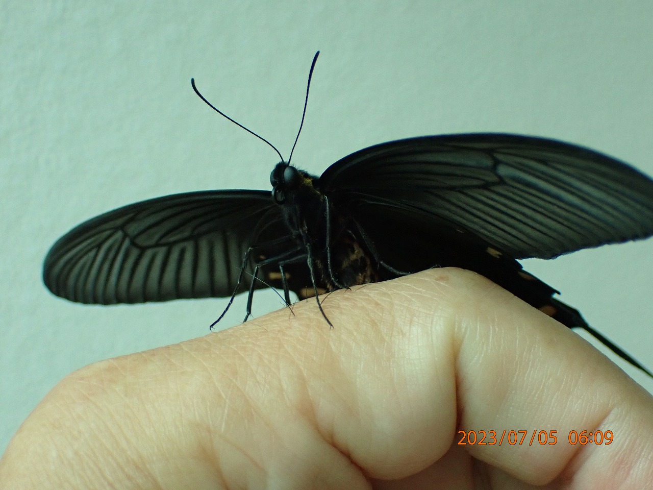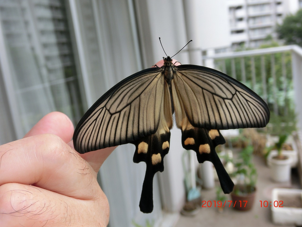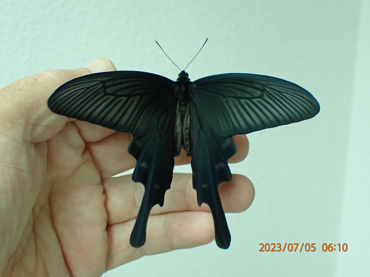 羽化後、手の上で思い切り開翅したオスです。