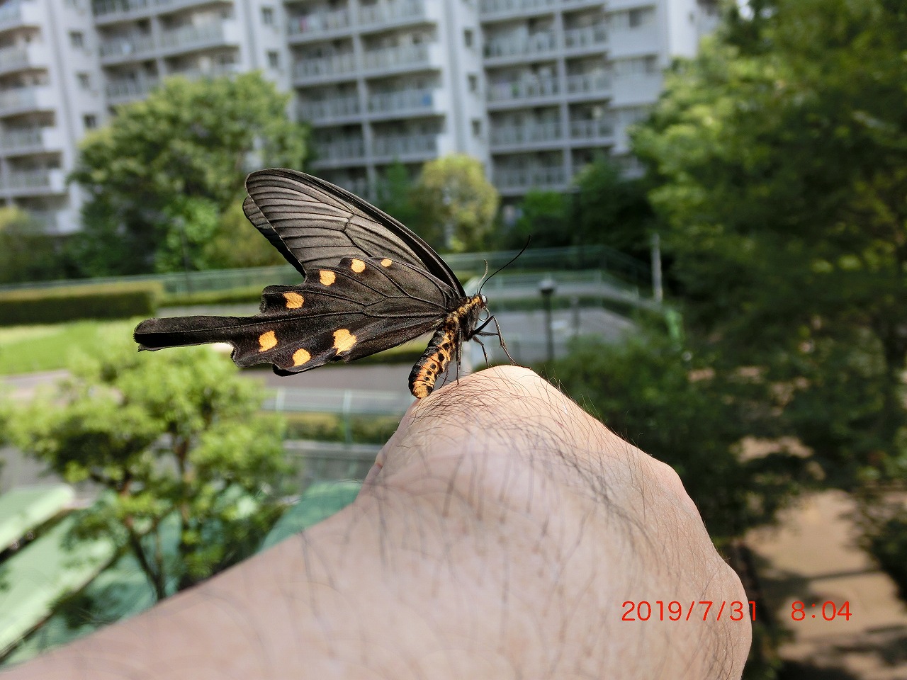 ジャコウアゲハは私にとって最も馴染みのチョウの一つです。もう10年以上前に飼育を始めて、毎年20頭ほど、多い年には40頭以上羽化させています。飼育をすると当然のように手乗りをさせて、それからから放してやることになります。冒頭の写真はその飛び立つ直前の姿です。
