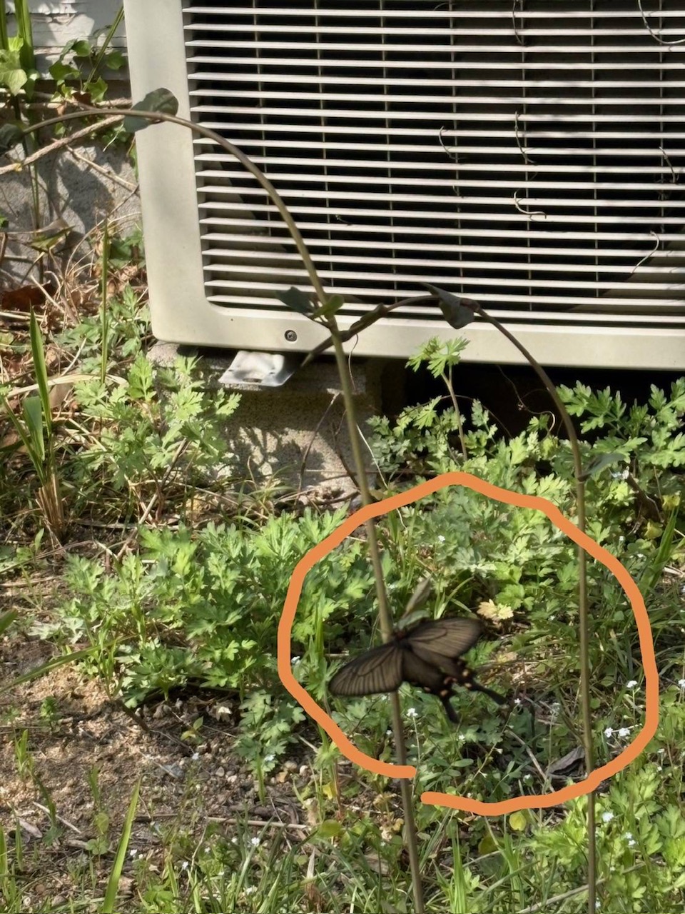 最近、関西の友人からうれしい写メをもらった。その人は、一昨年からジャコウアゲハを自宅の庭に呼ぼうとウマノスズクサを植えて、まだ来ぬかまだ来ぬかとジャコウアゲハの飛来を心待ちにしていた。そしてついに4月の中旬に1頭がやって来た。その時の送ってくれた写真がこれだ。大きく〇がつけてある(笑)。立派なメスのようだが、その時産卵したかどうかまでは聞いていないが、今年はもっと期待できそうだ。