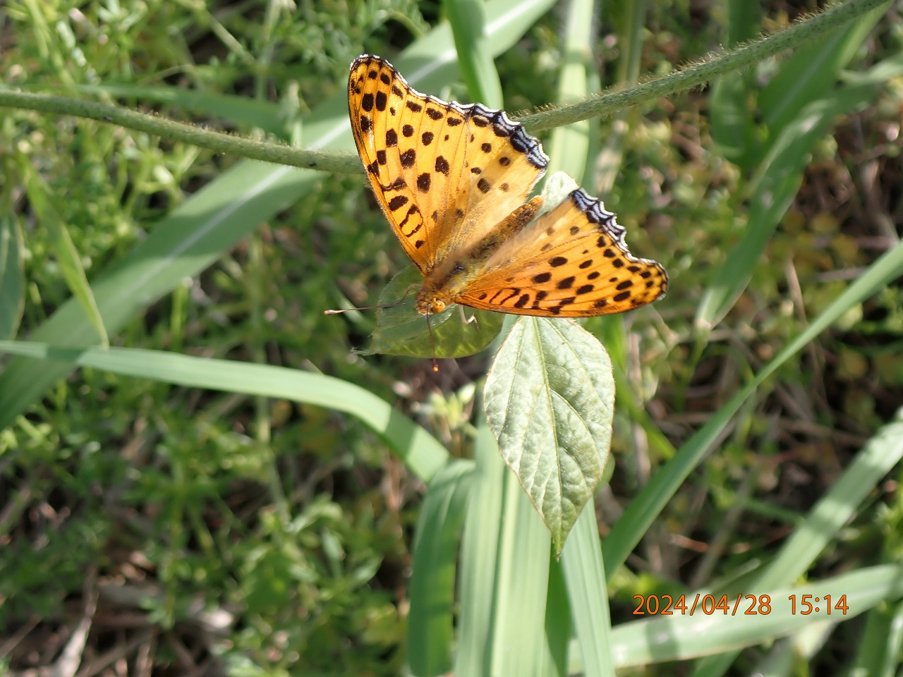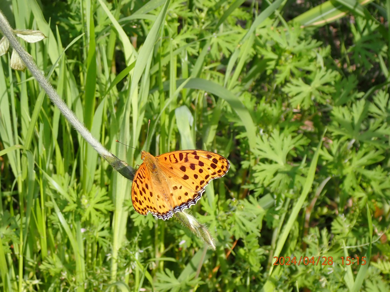 この時期、多摩川ではまだメスのツマグロヒョウモンには出会えていない。オスばかりで、同じ叢の上を低く忙しそうに行ったり来たりするが、吸蜜する花を探しているようには見えない。おそらくメスを探しているのだろう。なかなか止まってくれないが、ちょっと小休止したところで、あまり構図も考えずに撮った。