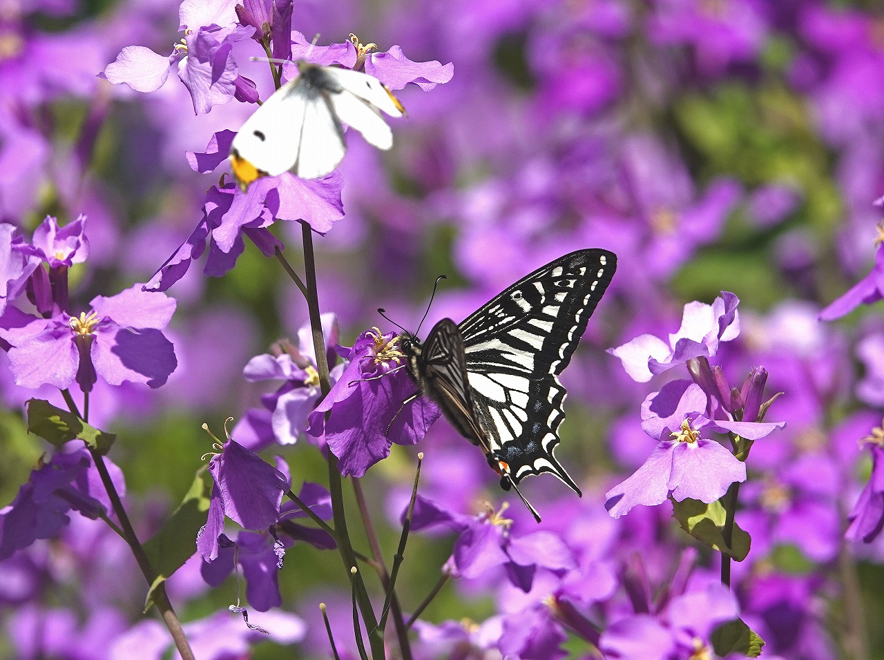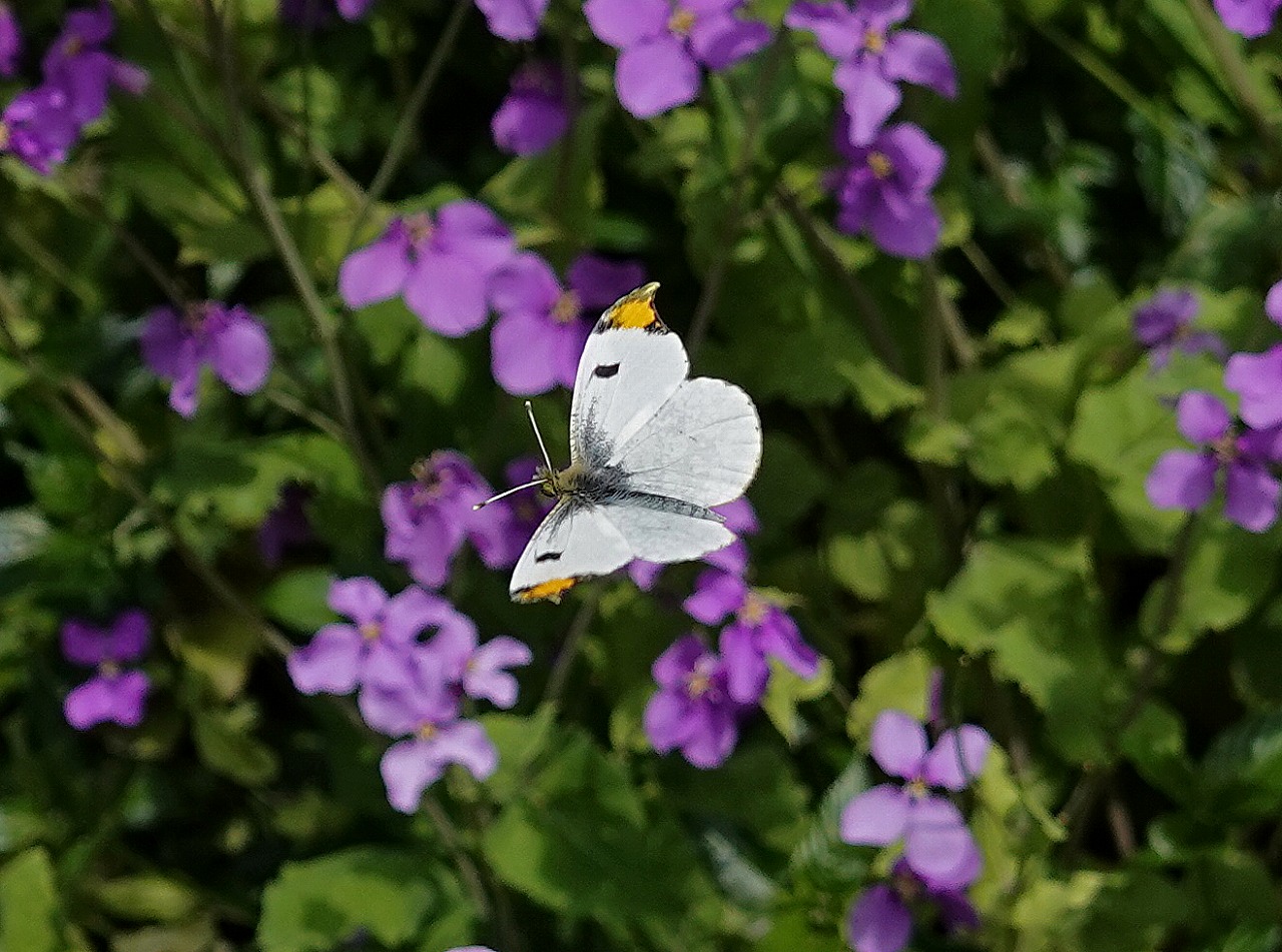前回訪問時に咲き誇っていた紫のオオアラセイトウ(ショカツサイとかムラサキハナナとかいろんな呼び名があるアブラナ科の十字架植物)は相変わらず満開状態、そして期待していたツマキチョウも飛び回っていた!昨年の記録を確認すると4月7日、本日が4月5日なので殆ど同じで何も心配することはなかった、一安心。