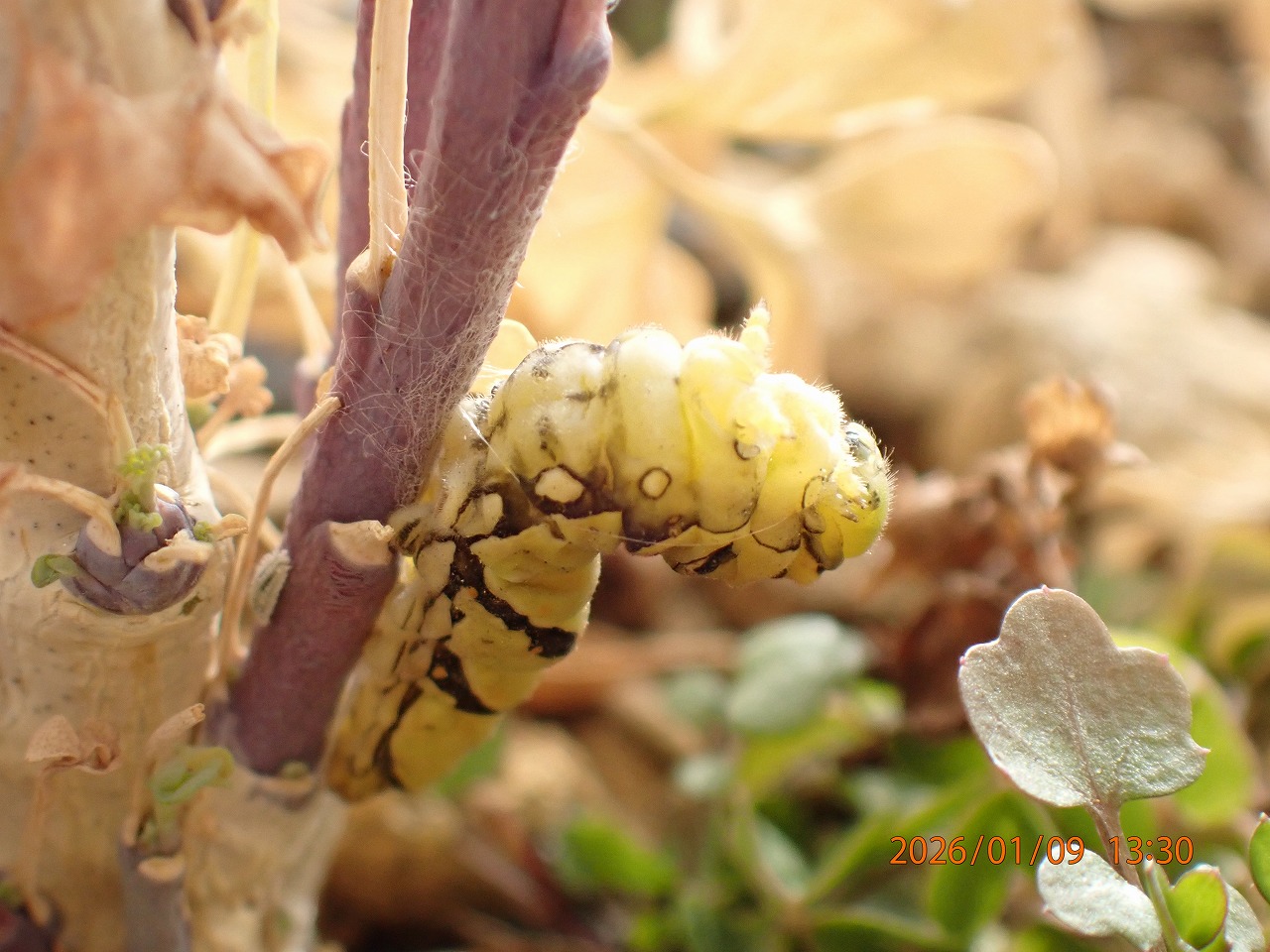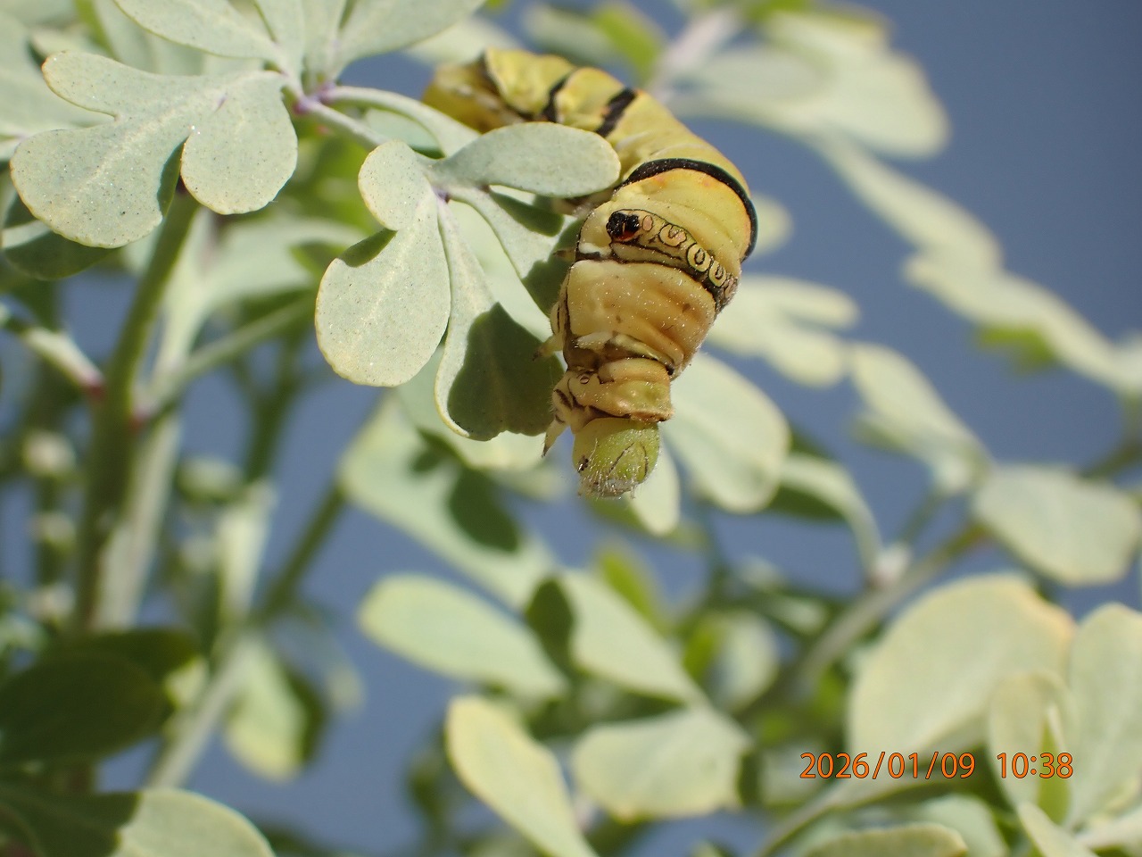 1月9日の昼間のこと、幼虫がベランダの床を這っている。誤ってヘンルーダの葉っぱから落ちてしまったかと思い、元いた葉っぱに戻してやったが、落ち着かず葉っぱの上をあちこち這いまわり何か探し回っているようだ。