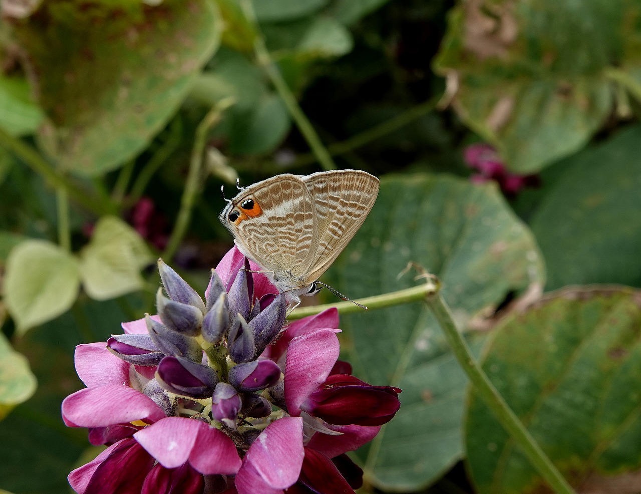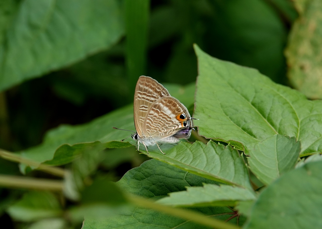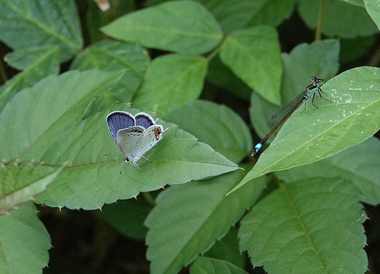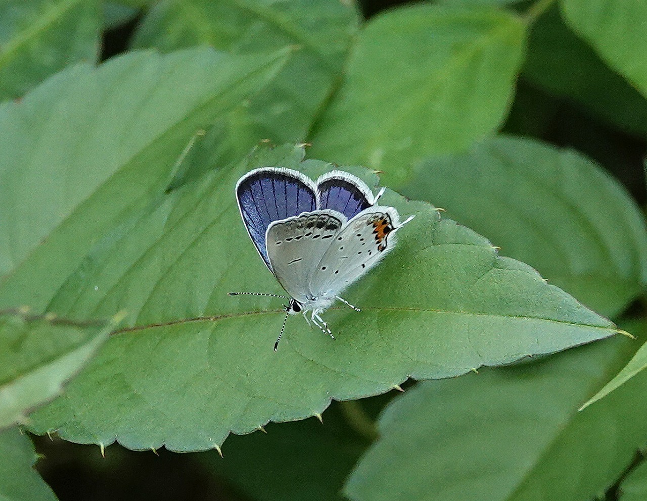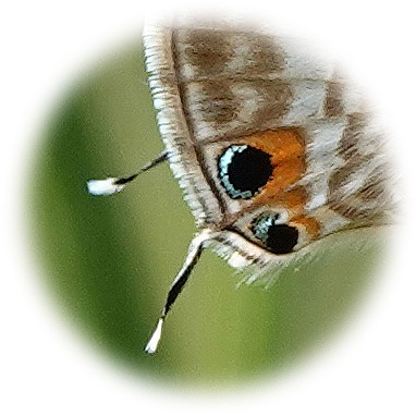今年は初めて見るウラナミシジミ、新鮮な個体で後翅をスリスリさせて奥の方の翅の表の青紫が僅かに見えている。尾状突起周辺の眼状紋や青藍のラメも印象的。