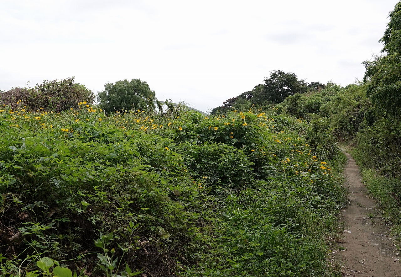 ↓ キクイモが咲く小径、登戸に近づく。小田急の鉄橋が見える