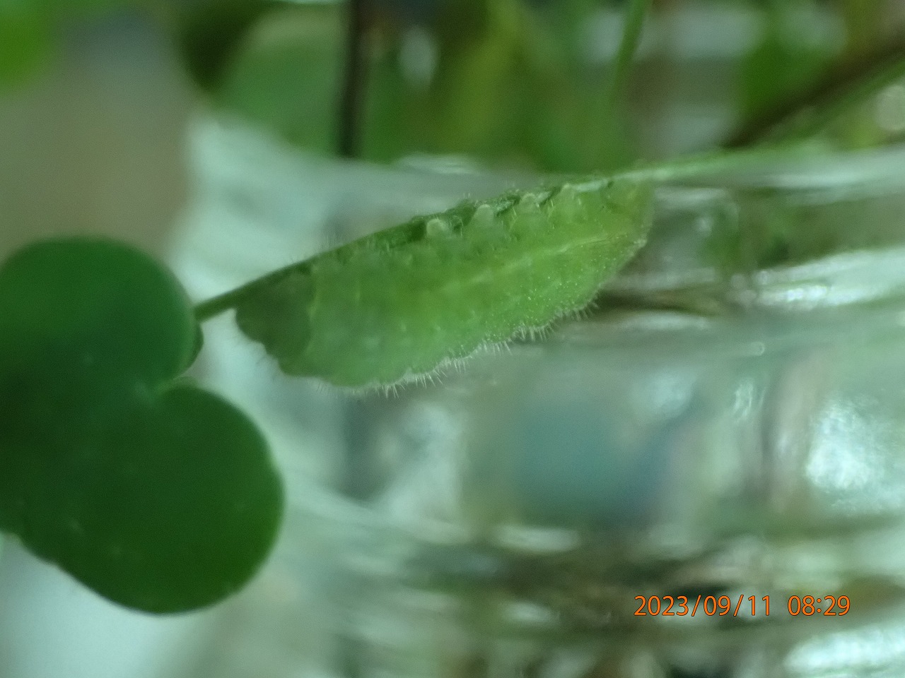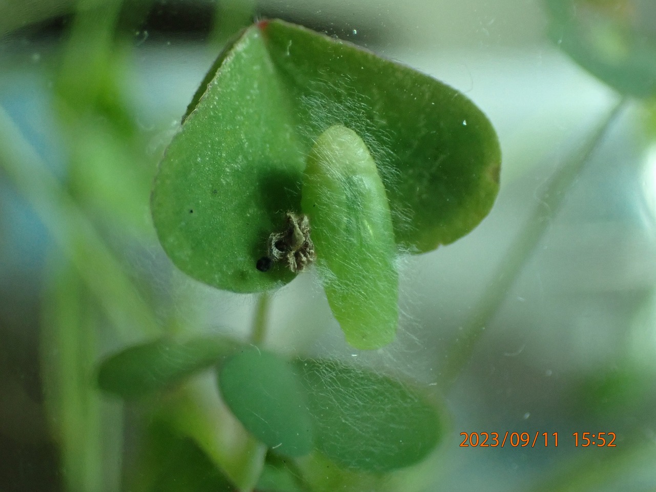 殆ど食い尽くされた鉢植えのカタバミ(飼育を始める前)。カタバミの葉は齧られてはいるが葉の形は薄くそのまま残っている。先端に小さい幼虫がいる。