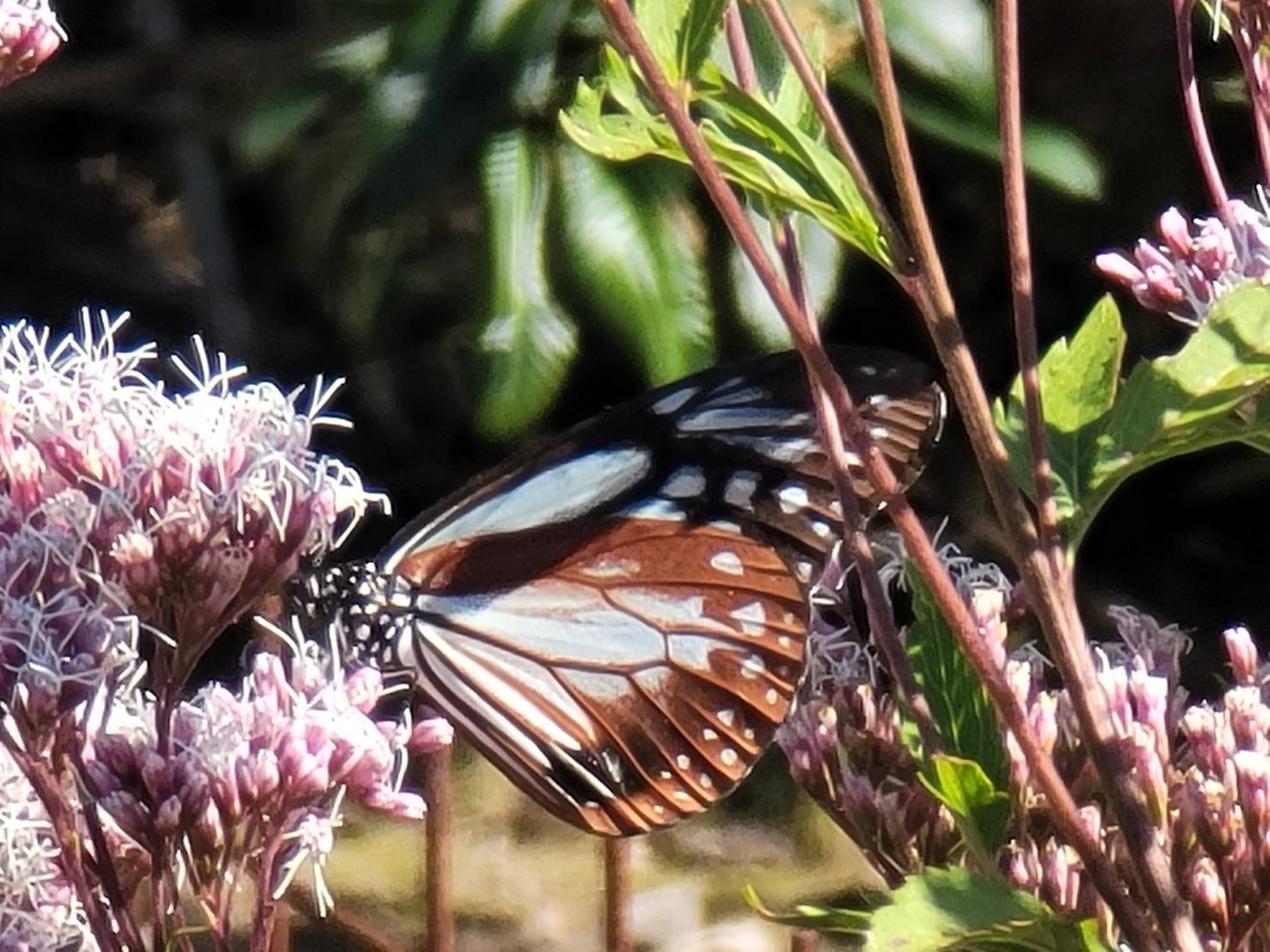アサギマダラは長距離の渡りをすることでも有名なチョウだが、日本の各地(多くは西半分の地域)にはアサギマダラが渡りの途中に決まって立ち寄る場所がある。この友人の住むところにもアサギマダラが好むフジバカマなどの花が自生しており、渡りのコースにあたっているようだ。それに加えて、その近隣の方々はもっと多くのアサギマダラを呼ぼうと、畑にさらにフジバカマを植えてチョウを迎えているという。私から見れば羨ましい話だ。大群のアサギマダラに囲まれてみたいものだ。そして、アサギマダラはここで一休みしたら、さらに南へ南へと渡っていくのだ。