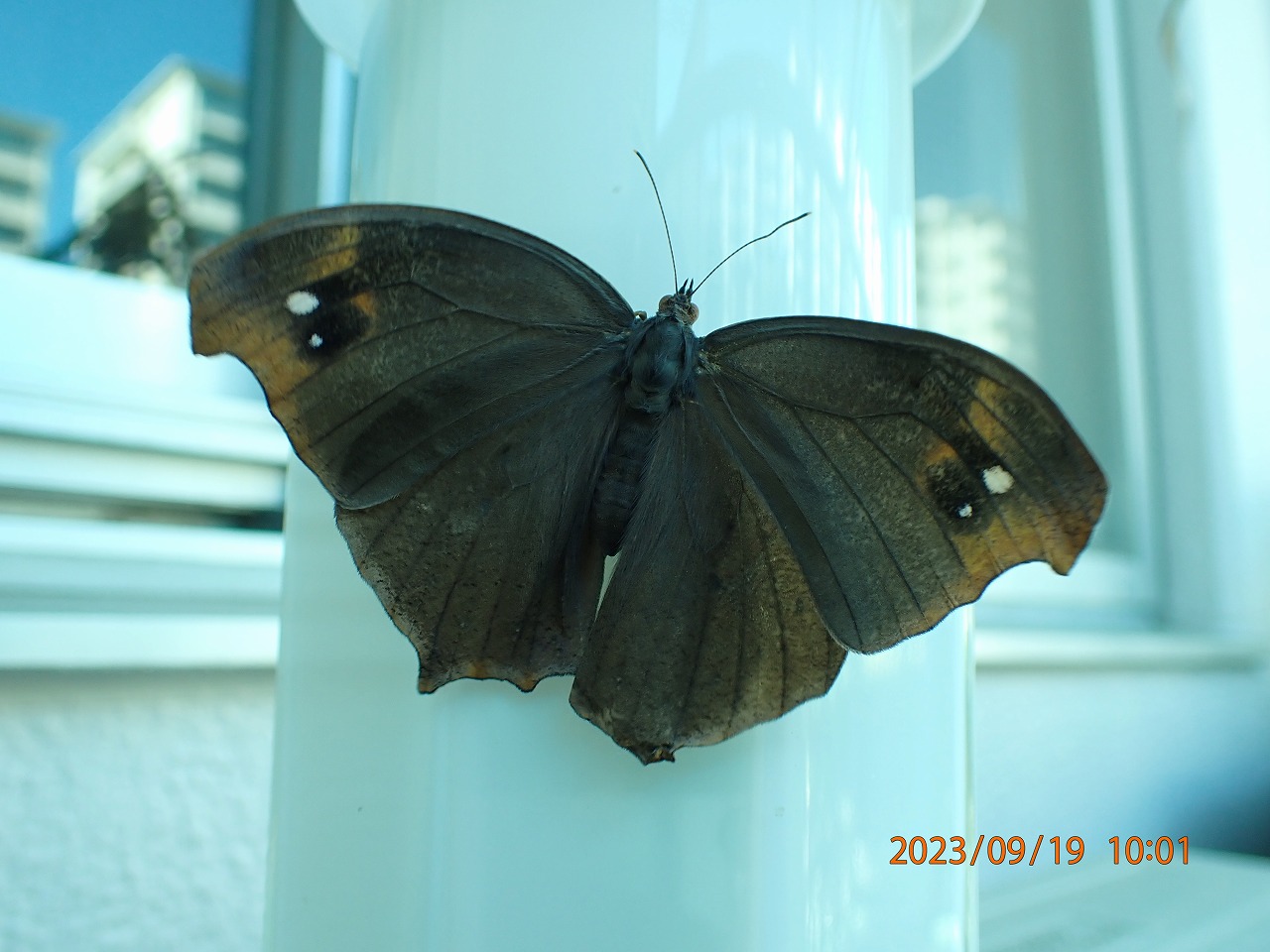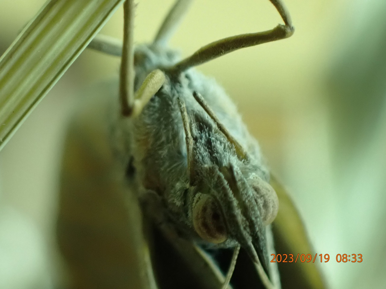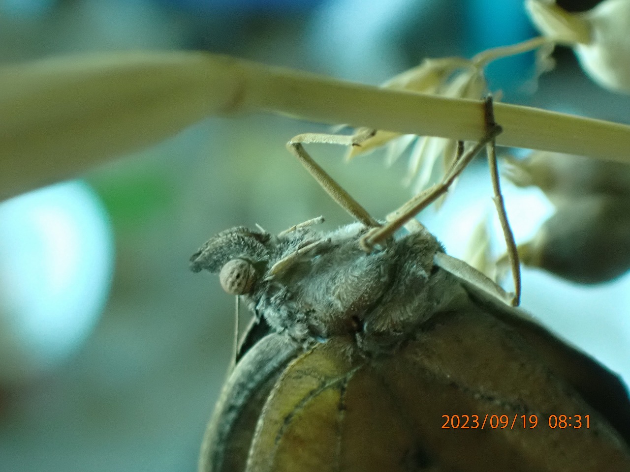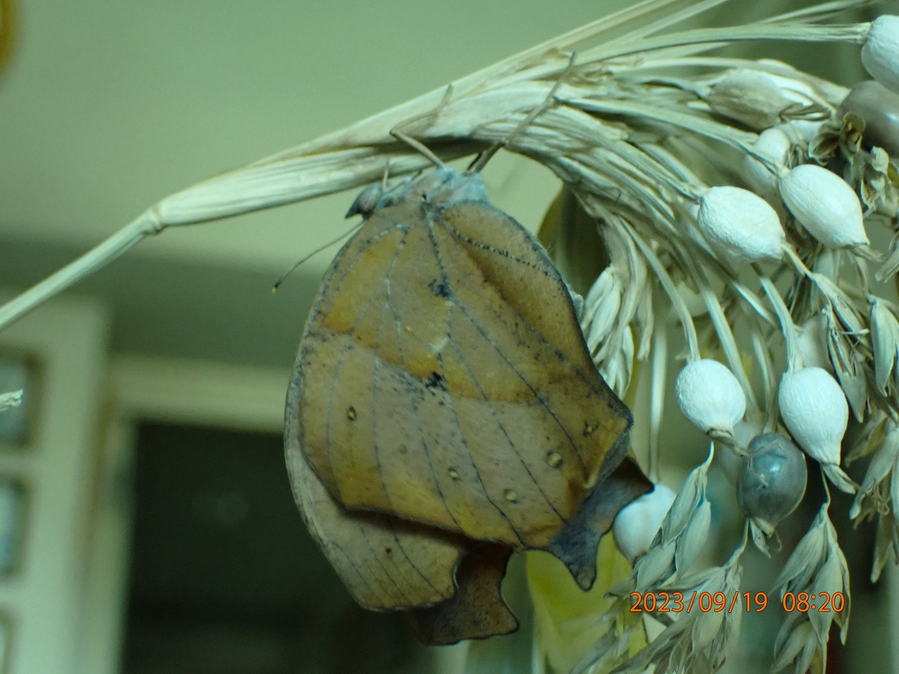 昨年秋、飼育していたクロコノマチョウが羽化した直後のこと、よく見ると6本の脚全てを使って懸命にジュズダマの茎につかまろうとしているのでした。 本当にその前脚まで使ってつかまろうとしていたのかどうか分かりませんが、私にはそのように見えました。 それが冒頭の写真です。しかし、その後はやはり胸のところに折り畳まれた状態になりました。