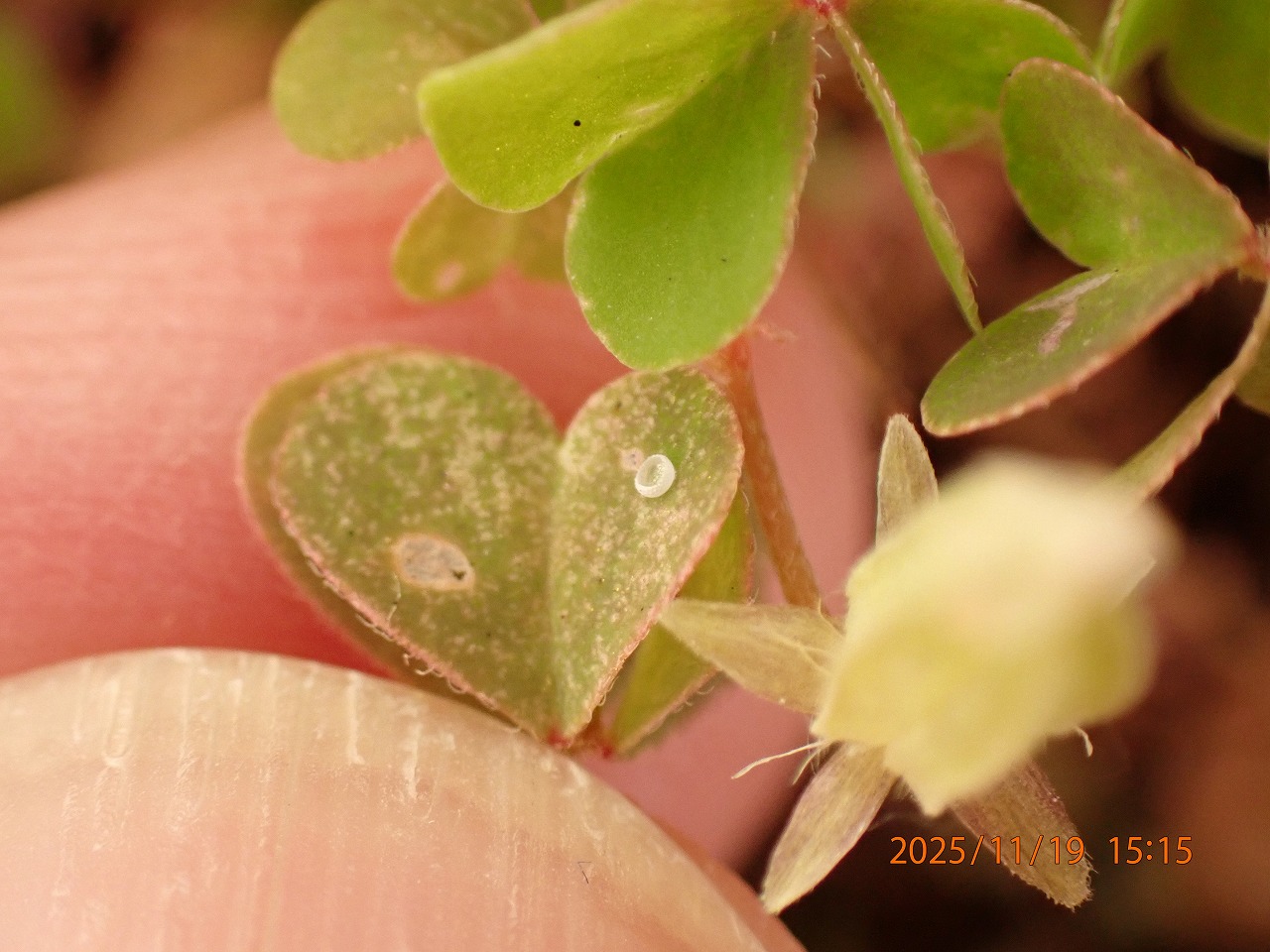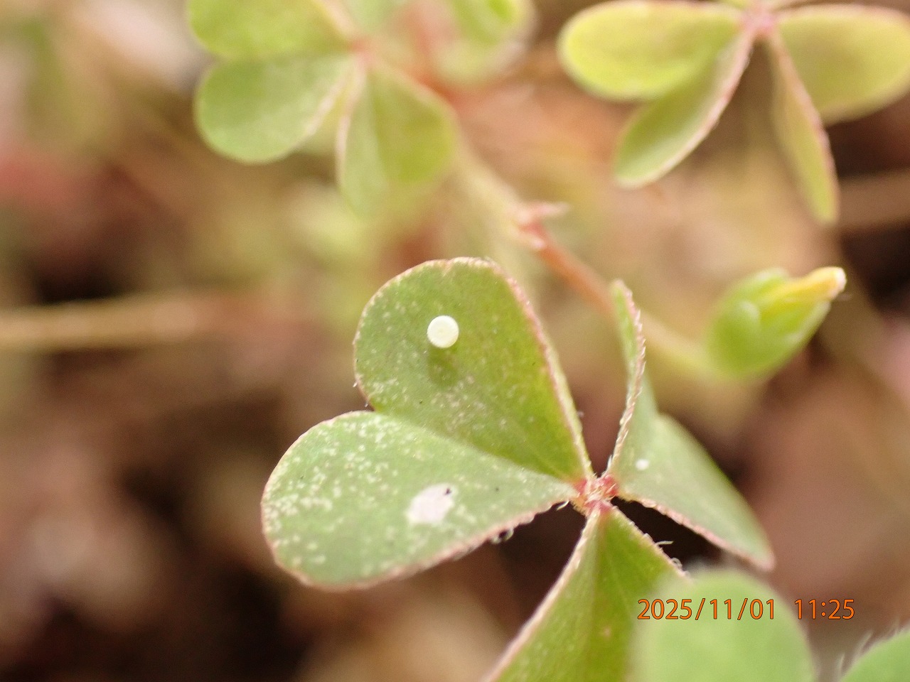 ついでに、産卵直後の写真を手掛かりにカタバミも調べてみた。すると、卵の抜け殻がそのまま残っている葉も見つけることができた。孵化直後のヤマトシジミの幼虫は卵殻は食べないようで、そのまま残されていた。また付近の葉にも食痕も見られた。