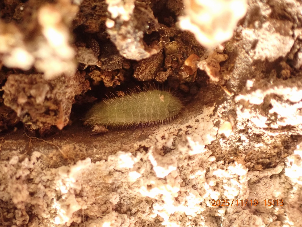 翌日11月20日にもう一度幼虫を探してみたが、随分移動して思わぬ所にいた。おそらく昨日と同じ個体だろうが、もしかすると何頭もいる中の別個体(?)かもしれない。ともかく複数回産卵されているはずなので、何頭が幼虫になっているかわからない。昨年などは、1月2月になっても新しく幼虫の個体数がどんどん数えるたびに増えてきた、しかも大きさの異なるものが、という奇妙な現象を体験している。