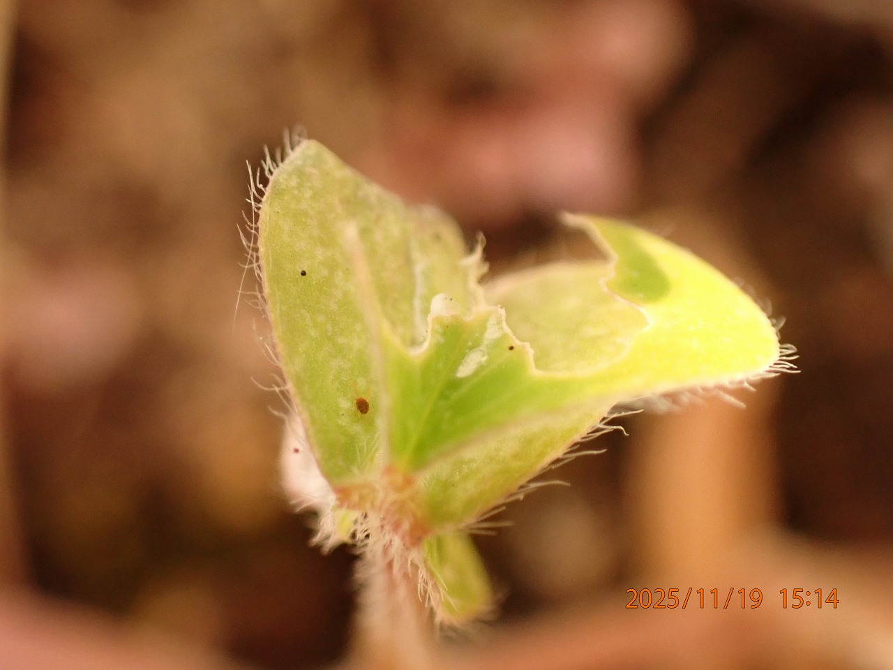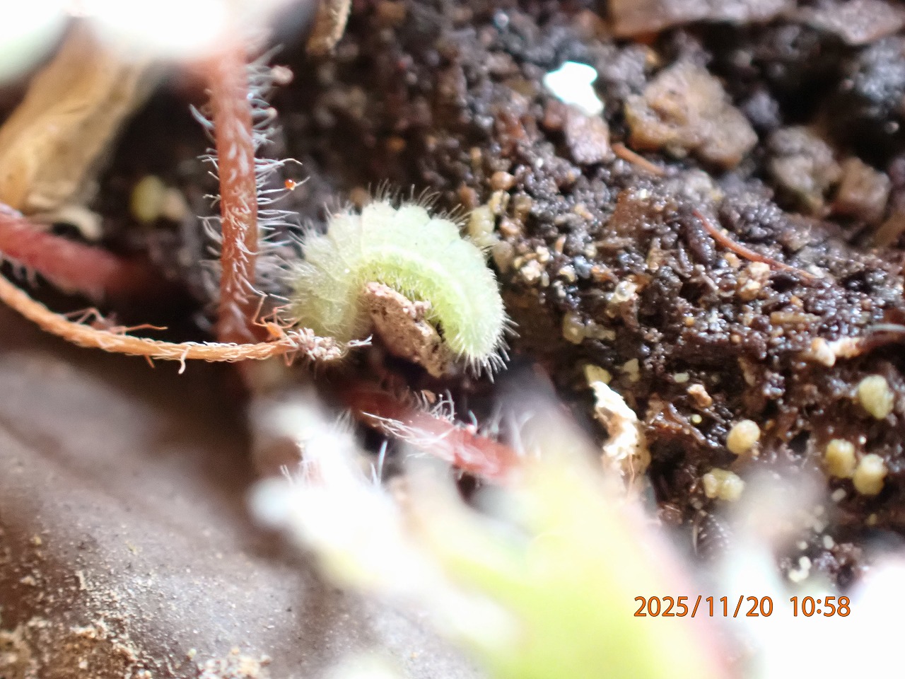 そうだった、ヤマトシジミもわが家で卵を産んでいたのだ。ということで、幼虫を探してみたところ、去年越冬幼虫のためにカタバミを植えていた小さな植木鉢の片隅の土のところで1頭3-4㎜の幼虫を見つけた。カタバミの枯れた葉などでごちゃごちゃしているところにはまだ隠れているかもしれないが、まずこのくらいの大きさにまでならないとなかなか見つけるのは大変だ。