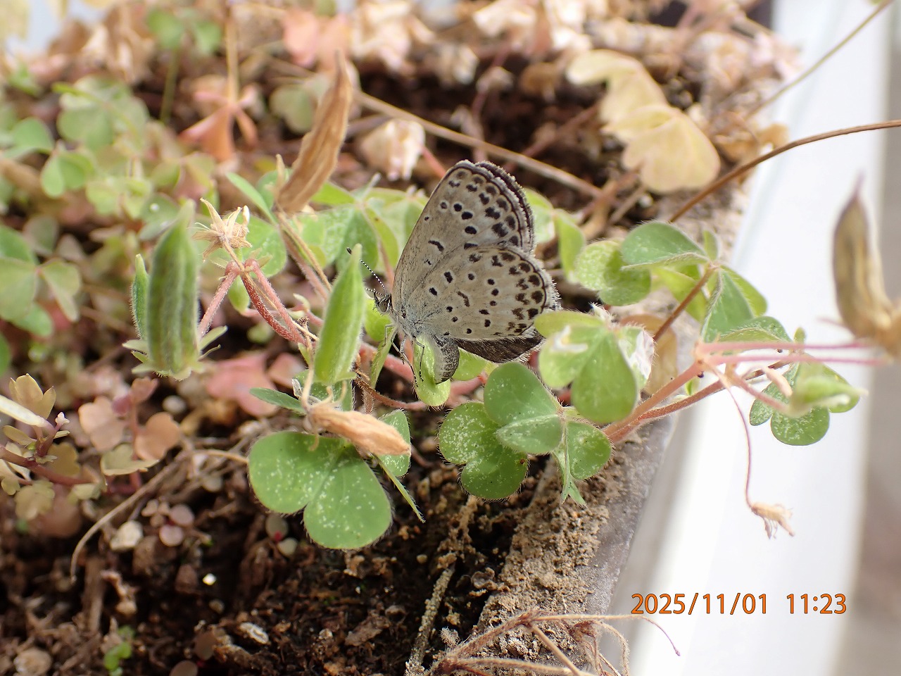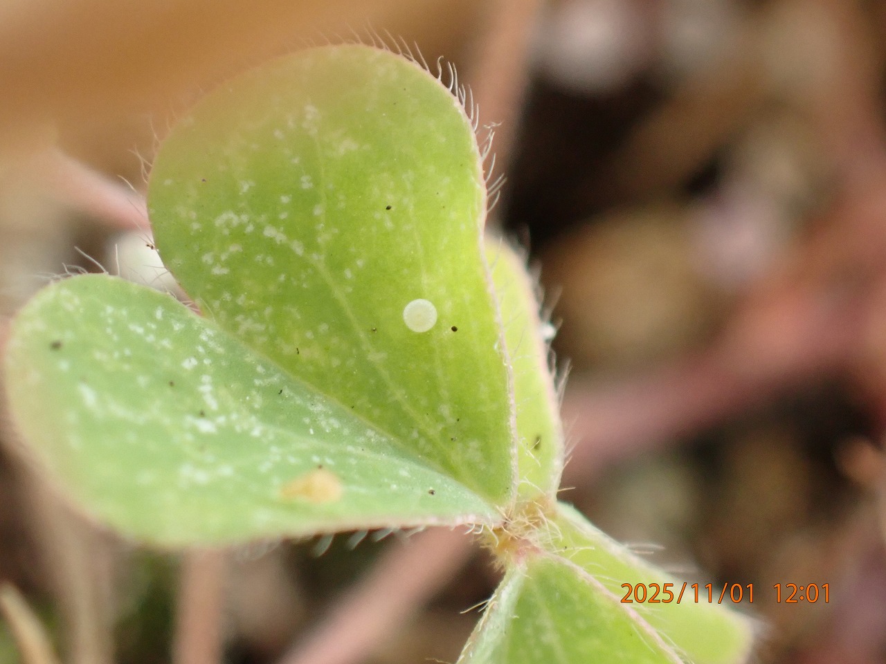 わが家のベランダのカタバミを目指してまたまたヤマトシジミがやってきた。この時期にはまだ屋外にはたくさんのカタバミが生えているだろうに、わざわざ小さな鉢植えの貧相なカタバミを選んで4階まで上がって来ている。と、思いながらも、熱心に産卵する様子を見ていた。気が付いたものだけだが、2個の卵を産んでいた。もっと他にもいくつも産んでいったと思うが、見つけるのはなかなか面倒だ。産卵ポーズをじっと見ていて産んだと思われるあたりを探しても小さな卵を見つけるのは容易ではない。産卵ポーズはしても実際に卵を産んでいないことも結構多いからだ。ともかく、今回みつけたのはこれだ。さらに初冬にかけて昨年同様産卵に来るのを期待している。