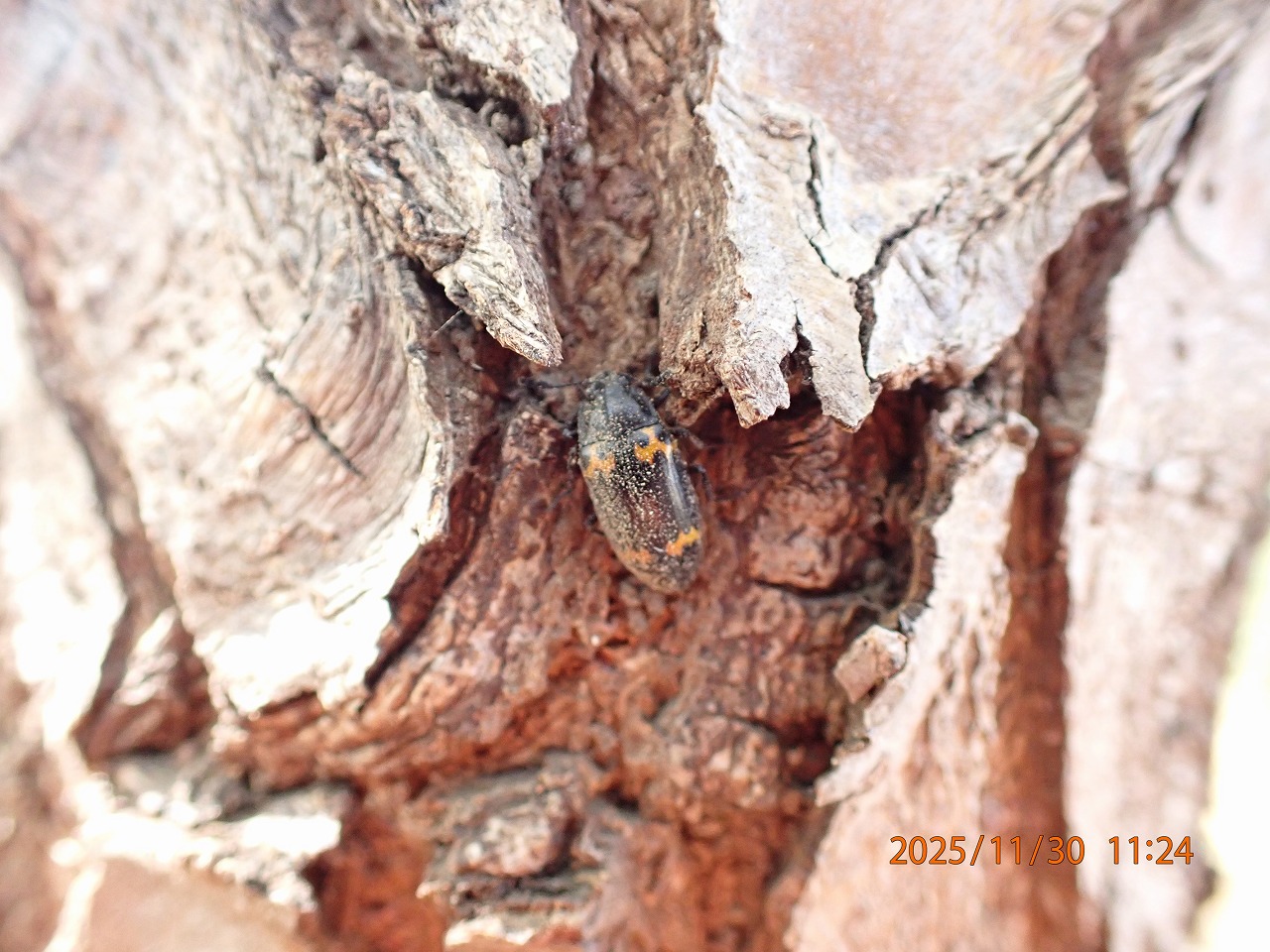 もう一つはヒメオビオオキノコというキノコを餌にする甲虫だ。体の模様は一見樹液に来るヨツボシオオキスイにも似ているが、それよりも若干大きく鋭い顎はない。